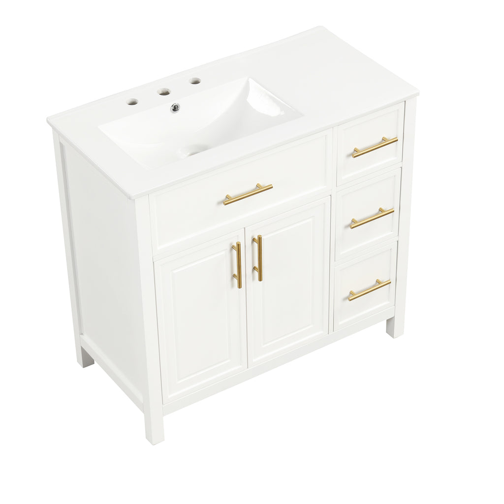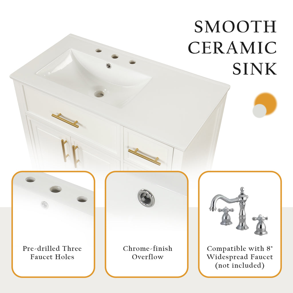 - Ceramic Sink: Made of solid ceramic, this white sink has an overflow and three faucet holes. It is so easy to clean that you can keep it smooth and shinning effortlessly. 8' faucet will fit this sink (not included).The cabinet's sink is on the left and ample storage space is reserved on the right so you can place some daily necessities such as towels and cups on it.