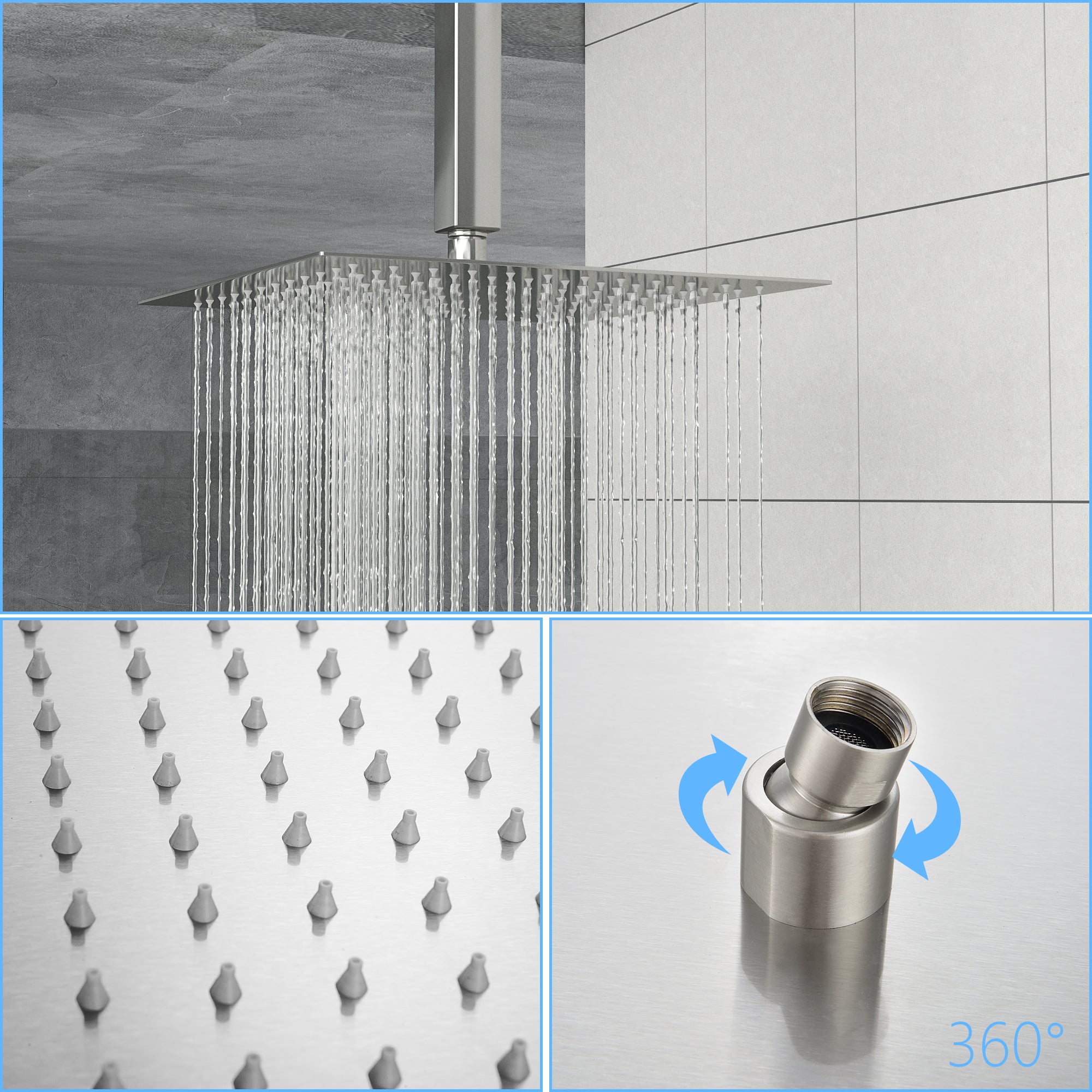 - {Included Components}12 inch Square rain shower head,Shower Arm, handheld shower head, 59' shower hose,shower holder, water control valve,Parts and installation instructions.
