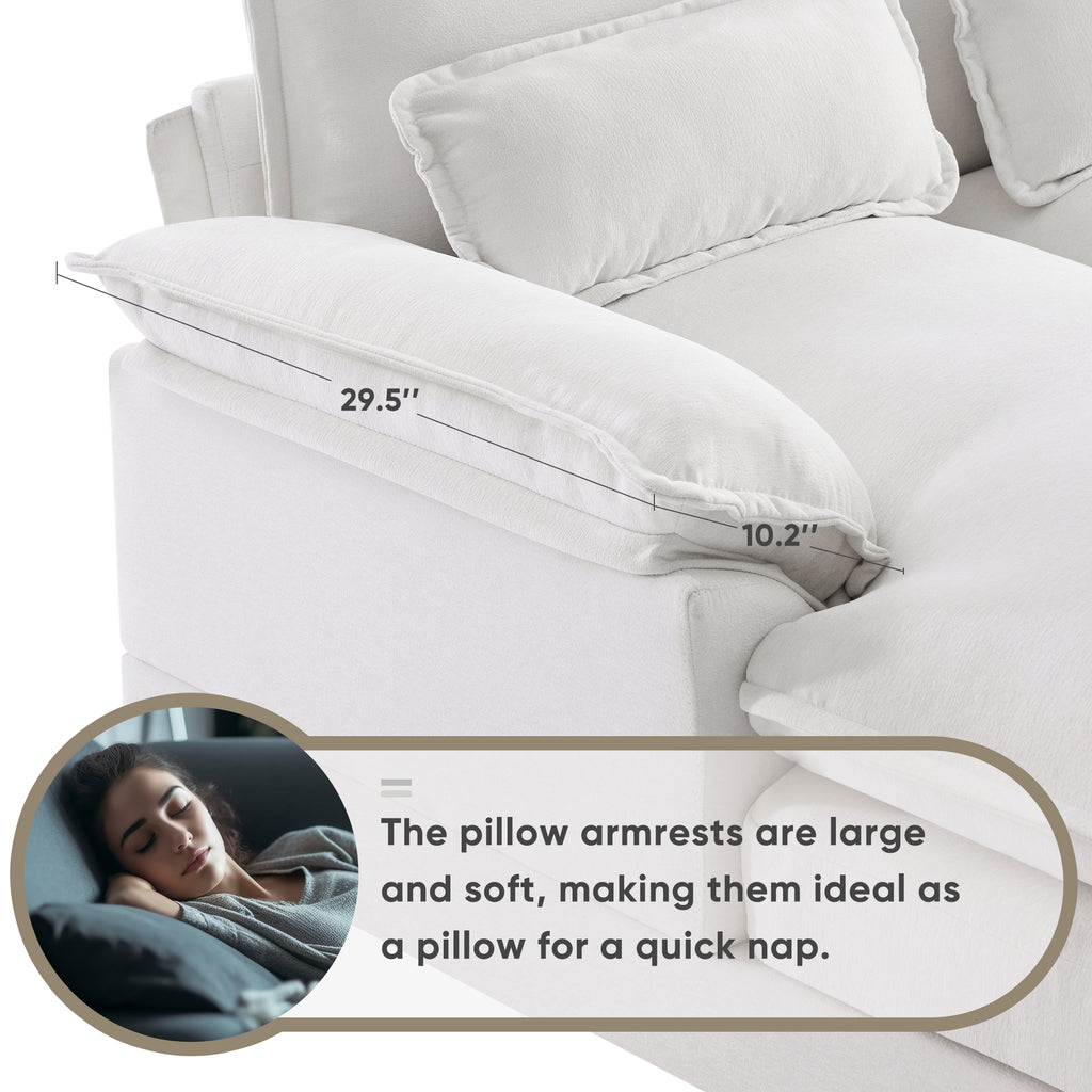 - Comfortable design: The white sofa is made of high-quality chenille, which is soft, comfortable and durable.Armrest pillows on both sides of the sofa can relax your head, and there are also 4 lumbar pillows to give better lumbar support, making it easy to adjust your posture and reduce discomfort and fatigue.