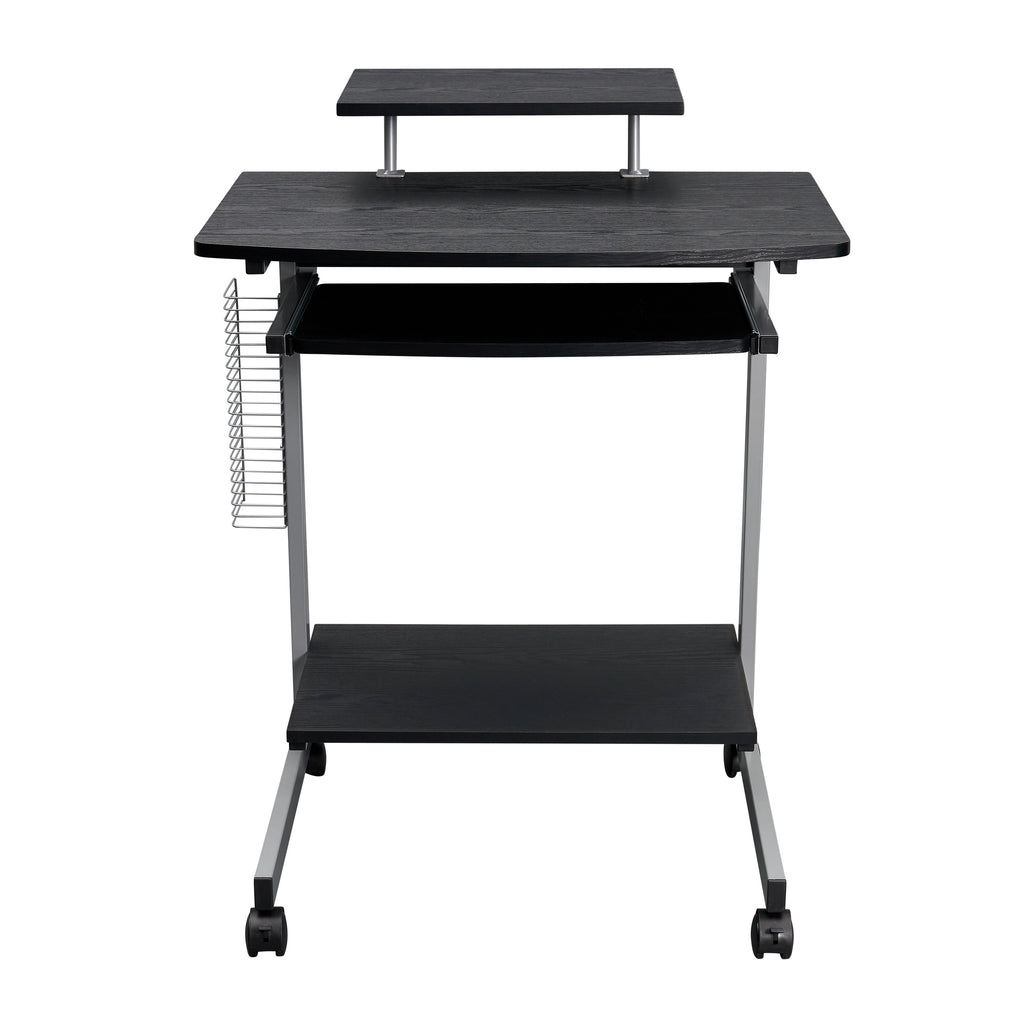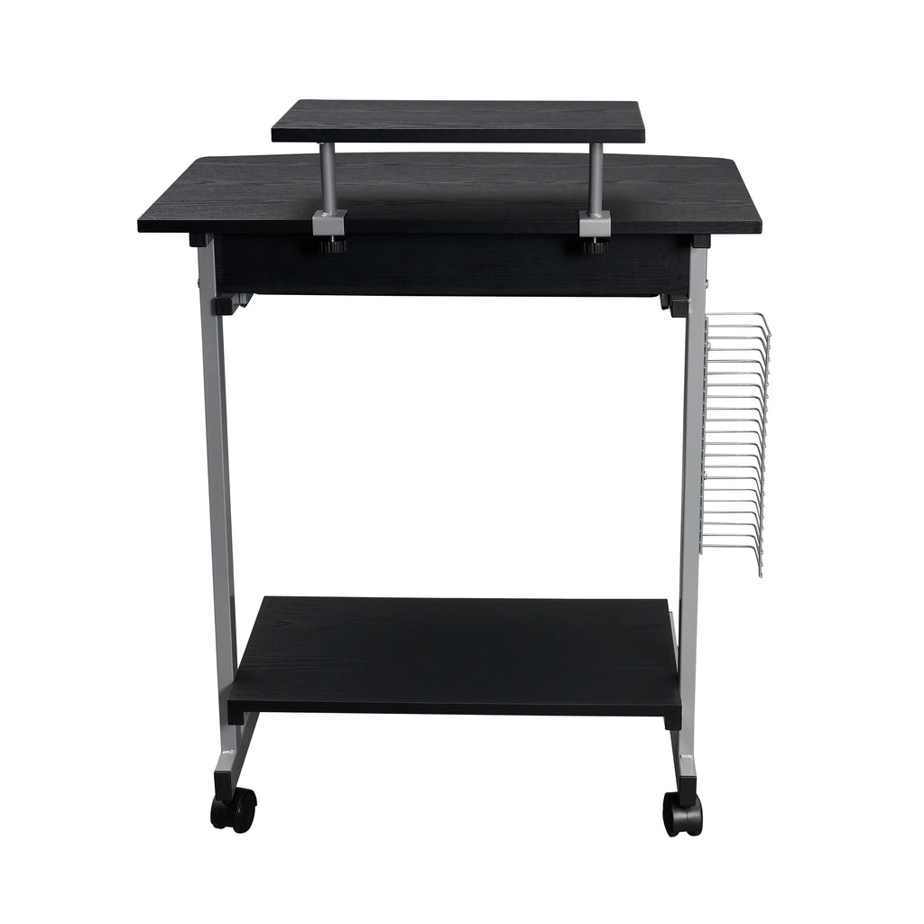 This Techni Mobili Compact Computer Cart is made with heavy-duty engineered wood panels with a moisture resistant PVC laminate veneer and a scratch-resistant powder-coated steel frame. The adjustable shelf can be mounted center, right or left of desktop. It also features a slide-out keyboard shelf equipped with a safety stop, side media rack for CDs or DVDs, bottom accessory shelf, large bottom shelf to accommodate a CPU and accessories, and large double-wheel non-marking locking casters. The desktop has a 100lb weight capacity, the shelves each have a 30lb weight capacity, and the keyboard shelf can hold up to 20lbs. Color: Espresso.