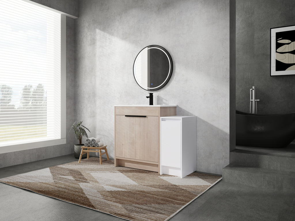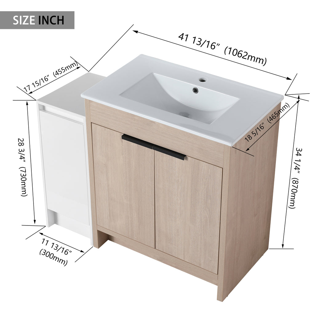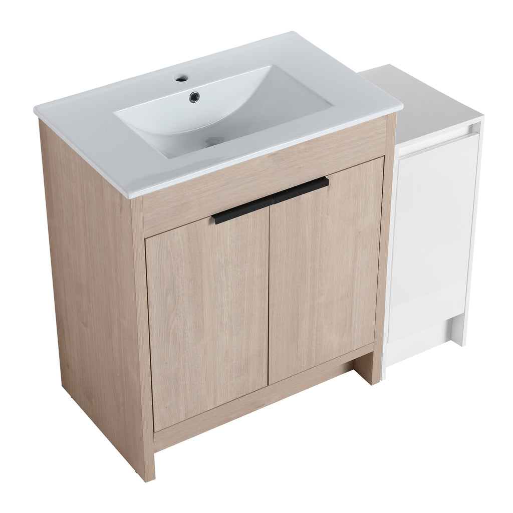 This freestanding bathroom combination cabinet not only boasts strong functionality but also incorporates a modern minimalist design, seamlessly blending with the overall decorative style of the bathroom. The integrated design of bathroom cabinet and basin makes the product more concise and elegant. The vanity of the bathroom and the storage cabinet are both equipped with adjustable shelves, which can provide classified placement of daily necessities for the bathroom. The additional combination of independent small storage cabinets provides a lot of extra space for the bathroom.