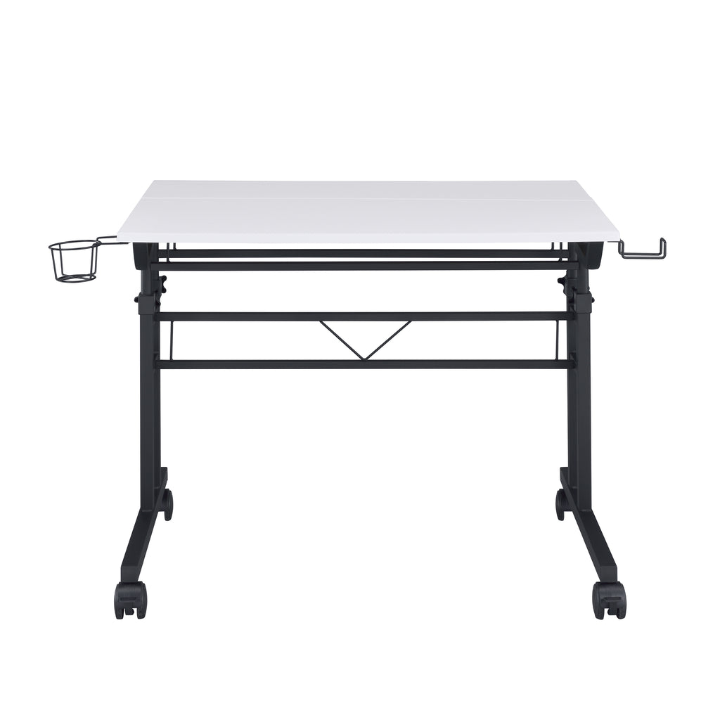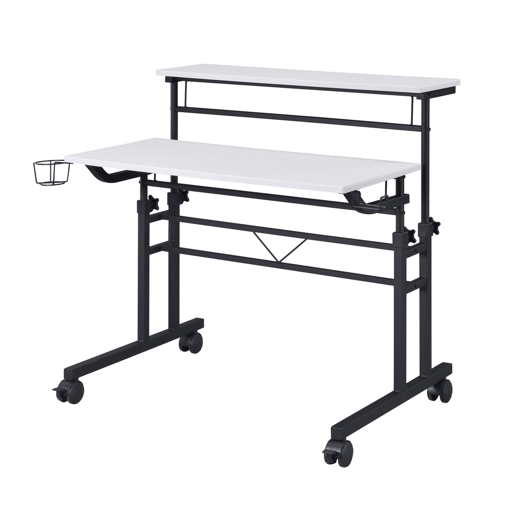 Mix industrial and modern styles together with this Techni Mobili Rolling and Adjustable Writing Desk. This desk is perfect for home-office spaces with its small footprint and offers option of 2 separate desktops independent levels with ample space that includes adjustable height mechanism. The finish coordinates with almost any decor while fiber-like texture tabletop surface and powder-coated metal frame and legs that give this desk a sturdy build along with a fun design. It includes front wheels with locking mechanism that let you swiftly glide in a home office space. The desktop is large enough to hold your laptop, notebooks, and office essentials while the other tabletop surface can be used as riser to keep items within reach. It comes with integrated headphone and cup holders that can be easily installed on right and left. It is easy to assemble, and comes with 5-year limited warranty.