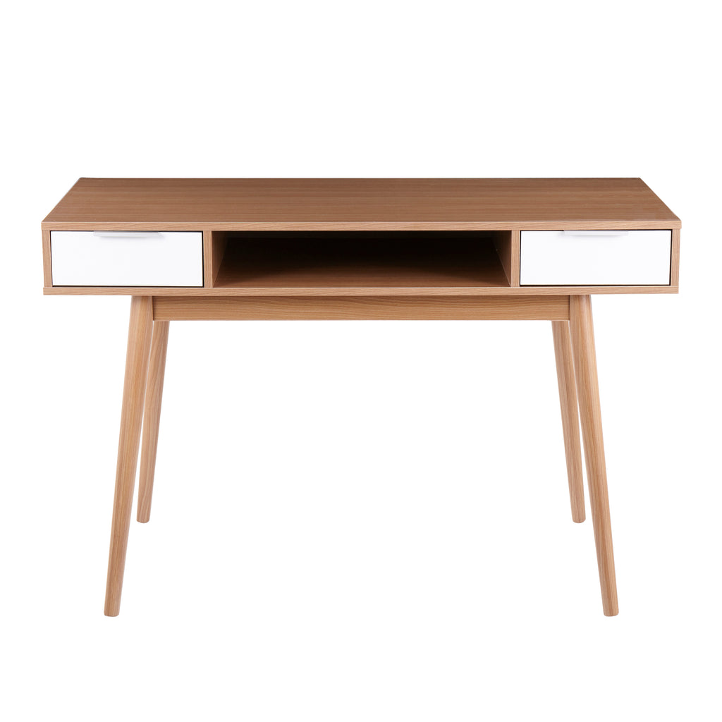 - Add casual style to any office space with the Pebble Double Desk by LumiSource. The Pebble Double Desk's simplistic design is accentuated by a large rectangular wood top, two drawers, and an open shelf, perfect for storing all of your supplies!