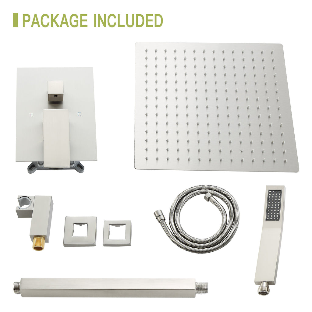 - {Included Components}16 inch Square rain shower head,Shower Arm, handheld shower head, 59' shower hose,shower holder, water control valve,Parts and installation instructions.
