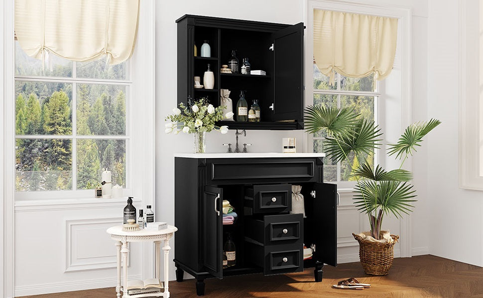 - [ Multi-Purpose Cabinet & Concealed Storage ] Are you looking for stylish and functional storage solutions for your bathroom? Our bathroom vanity provide ample space for all your toiletries and bathroom essentials. The combination of the cabinet body and the drawer perfectly stores all kinds of bathroom products and keeps the necessities away from water stains and dust. Soft-close doors and drawer fronts feature a water-resistant paint finish for durability.
