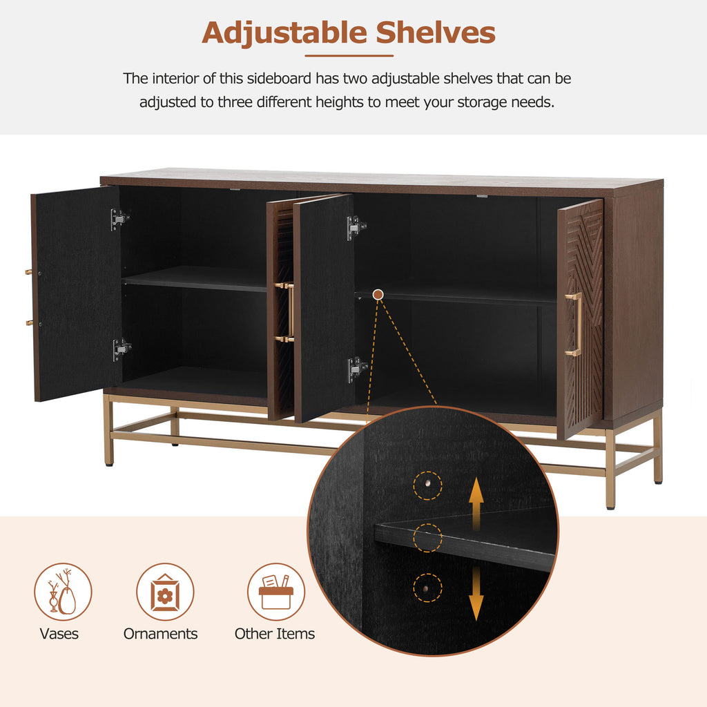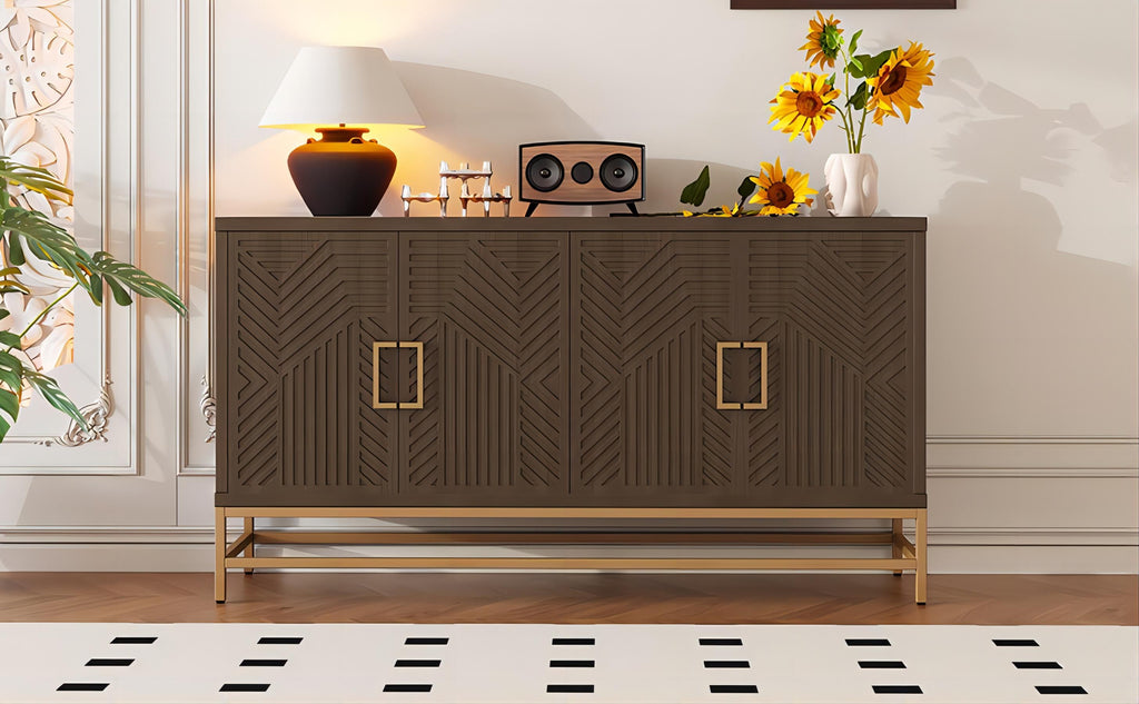 - Retro Style Sideboard: This retro-style Sideboard features a wooden cabinet with metal handles and legs, combining natural beauty with a sleek design. The surface of the cabinet uses staggered lines to outline a symmetrical pattern, giving a calm, heavy feeling and presenting a retro aesthetic. It is definitely the best choice for retro decoration styles, making it an ideal addition to your Kitchen, Living Room, and Dining Room.
