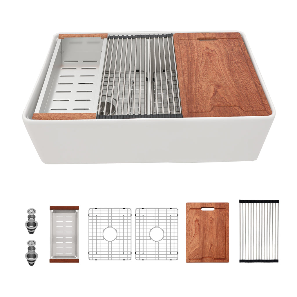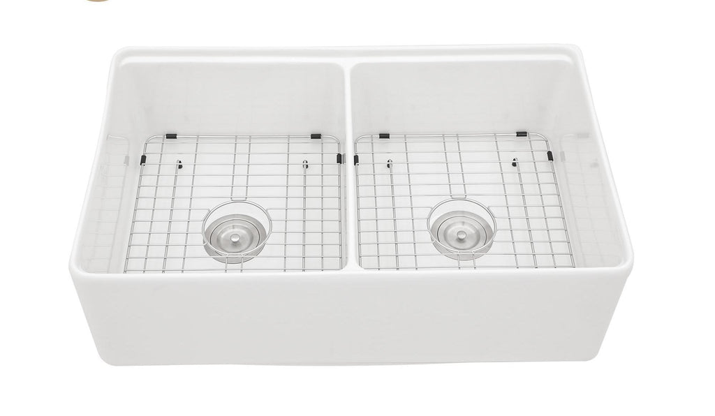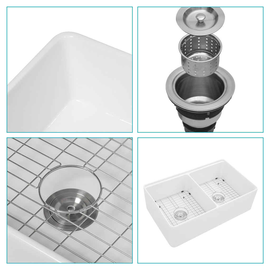 - This 33 inch white farmhouse kitchen sink constructed of ceramic for extreme strength and durability. Kitchen Sink surface is extreme resistance to chips, abrasion or scratches and discoloration for years of beauty and reliable performance.