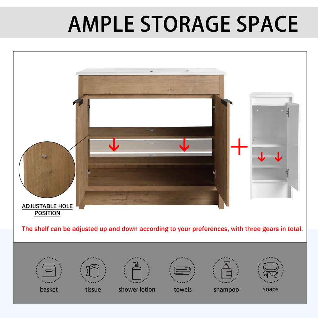This freestanding bathroom combination cabinet not only boasts strong functionality but also incorporates a modern minimalist design, seamlessly blending with the overall decorative style of the bathroom. The integrated design of bathroom cabinet and basin makes the product more concise and elegant. The two vanity of the bathroom and the storage cabinet are both equipped with adjustable shelves, which can provide classified placement of daily necessities for the bathroom. The additional combination of independent small storage cabinets provides a lot of extra space for the bathroom.