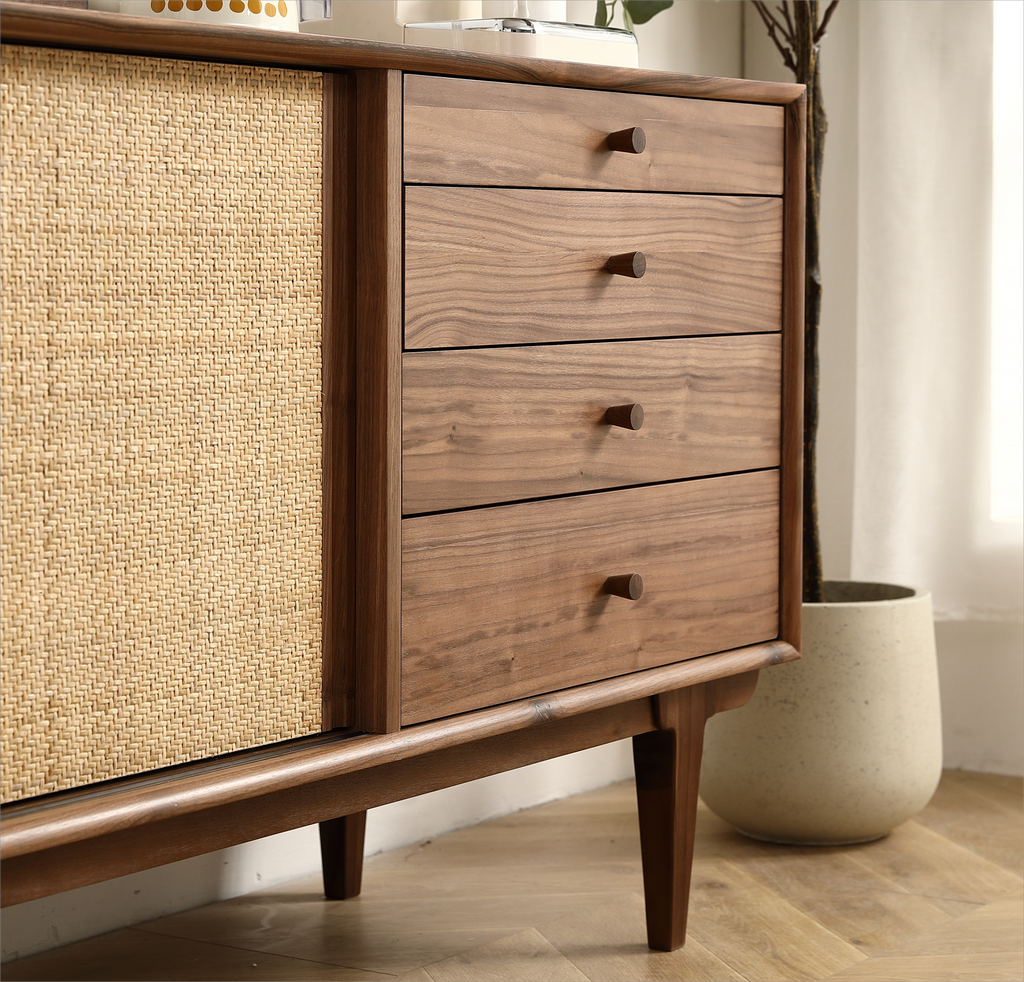 This Two Door Four Drawer Cabinet with Rattan Weaving is the perfect addition to any home that needs both style and practicality. Made with durable black walnut wood and natural vine rattan weaving, this cabinet is both sturdy and elegant. The rattan weaving adds a unique touch to the design and creates a warm and inviting atmosphere in any room. The cabinet features two doors and four drawers, providing ample storage space for all your belongings. The drawers slide smoothly and quietly, making it easy to access your items without disturbing anyone else in the room. The black walnut wood gives the cabinet a classic and timeless look that will never go out of style. This cabinet is versatile and can be used as a sideboard in your dining room or as a storage unit in your living room or bedroom. The natural vine rattan weaving adds a touch of warmth and texture to the design, making it a great addition to any home decor. The cabinet is 68.89 inches long, providing enough surface area for you to display your favorite decorations or hold your TV. The sturdy MDF construction ensures that the cabinet will last for years to come. The natural vine rattan weaving is tightly woven, making the cabinet both durable and easy to clean. The elegant design and quality craftsmanship make this cabinet a great investment for any home. In conclusion, if you're looking for a stylish and practical storage solution, this Two Door Four Drawer Cabinet with Rattan Weaving is the perfect choice. With its beautiful design, ample storage space, and sturdy construction, it's sure to be a great addition to any home.