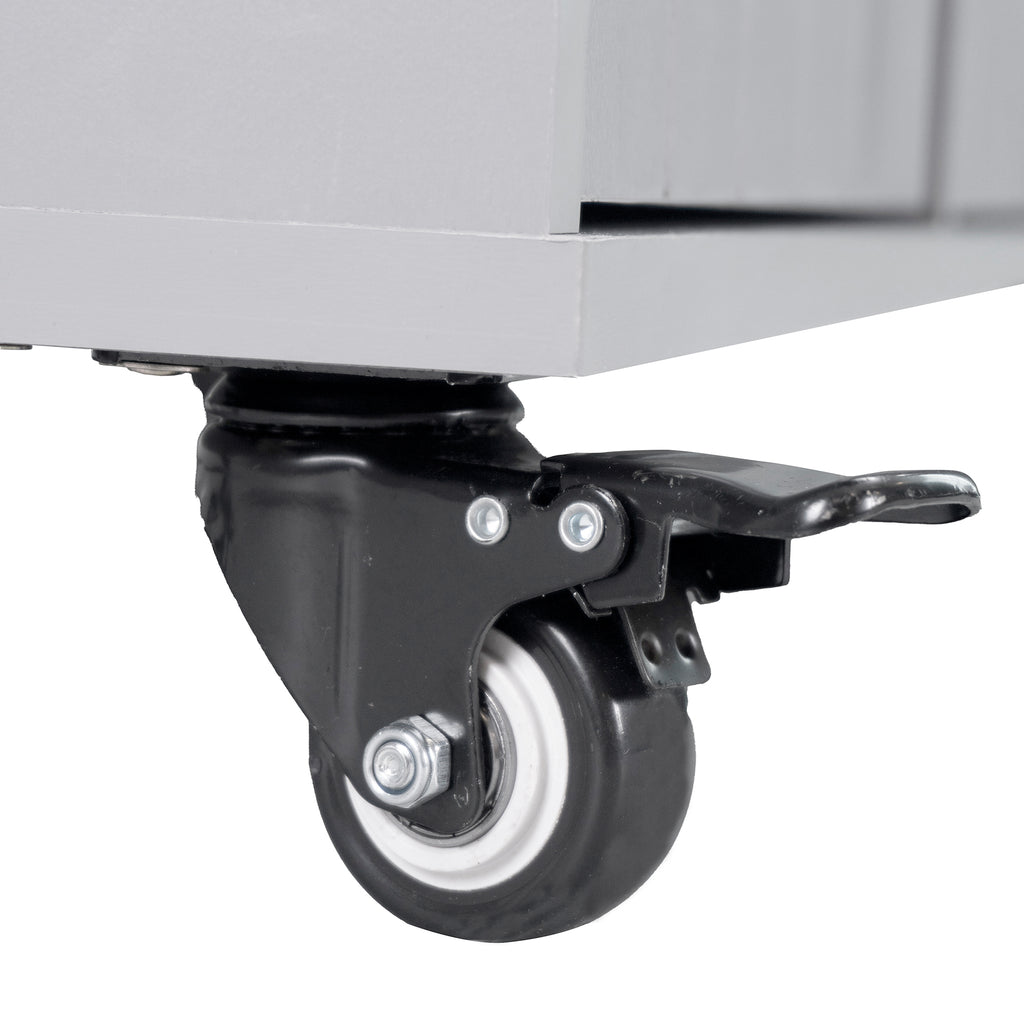 This mobile kitchen island on wheels is equipped with 5 universal wheels, 4 of which are lockable. Additionally, we offer six stationary cabinet feet as an alternative option if you prefer a stationary cabinet setup.