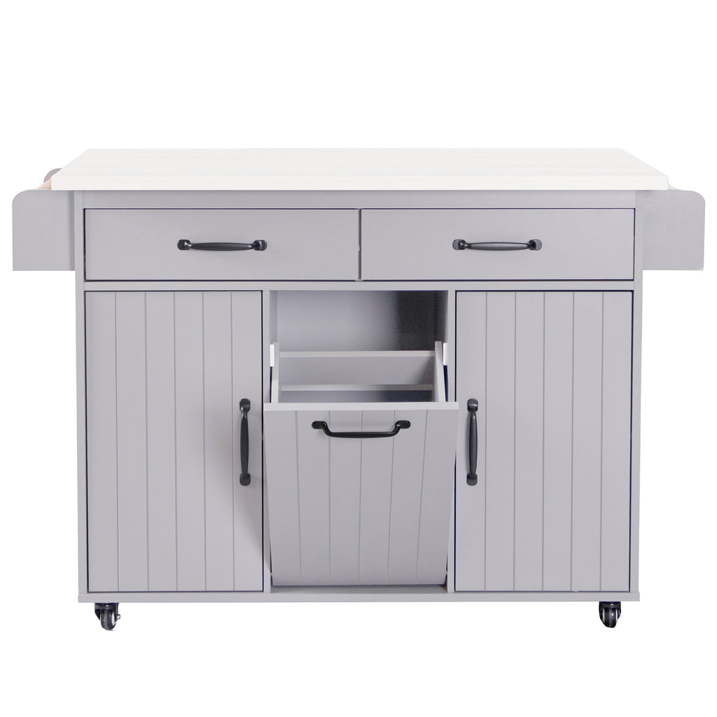 | Summary | This kitchen island brings significant savings to your cooking space and indoor storage. Constructed from P2 Grade Particleboard, stripes on the cabinet doors give it an attractive look. The multipurpose tilt-out trash can it carries is a great feature of the product, with two drawers, two cabinets, and a spice rack and towel rack, your kitchen essentials will no longer be cluttered. The rolling kitchen cart sits on lockable casters for easy mobility and stability. The thoughtfully designed drop leaf can be opened and folded. In addition, there are adjustable shelves for your flexible storage needs. |