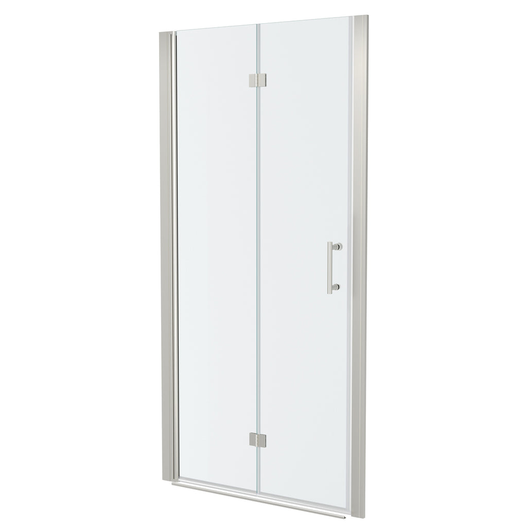 - Bi-Fold Frameless Shower Door: This shower door is 34 in. W x 72 in. H; Premium 1/4 inch (6 mm) thick tempered clear glass. Water-resistant Screen Defends Against Limescale, Ensuring Long-Lasting Cleanliness.