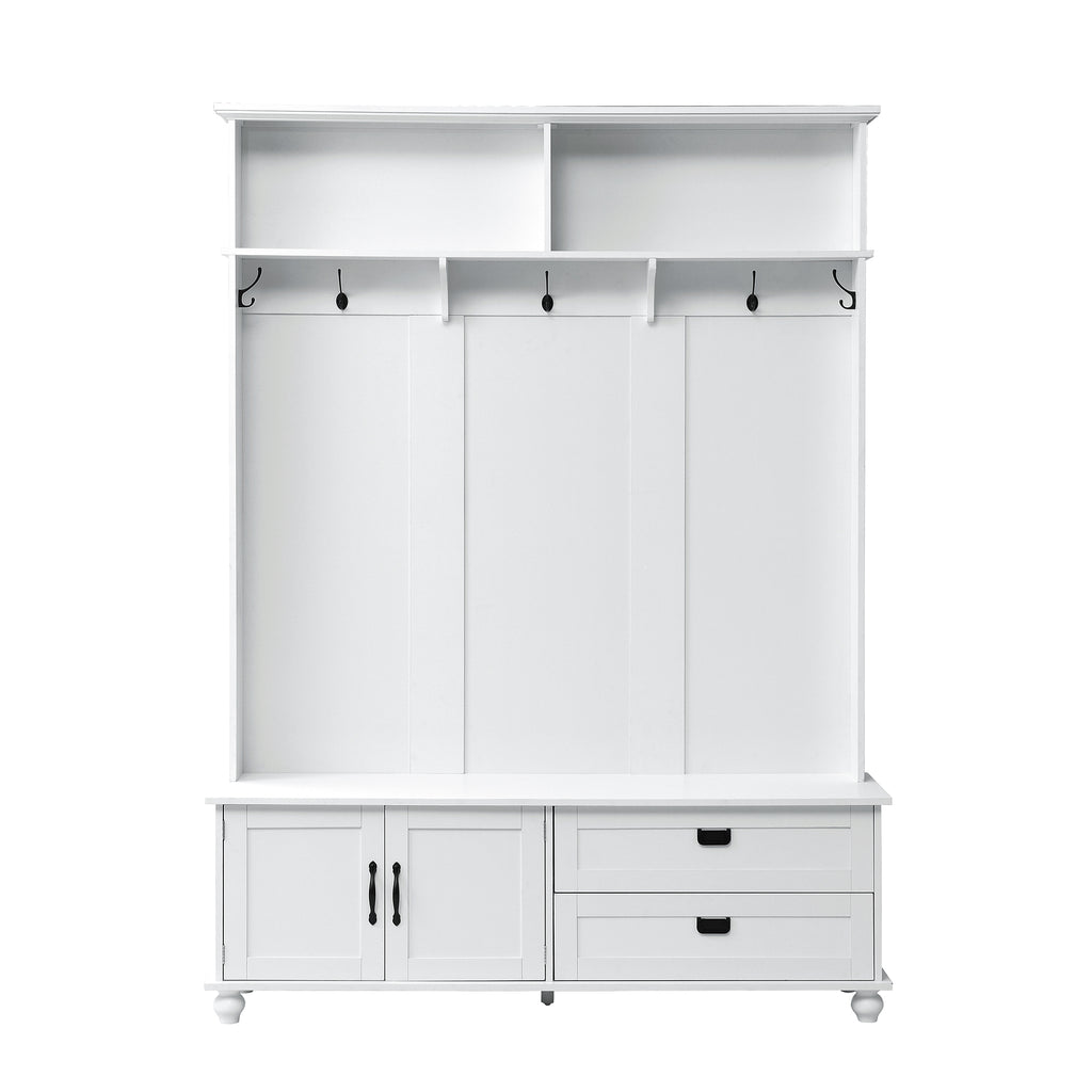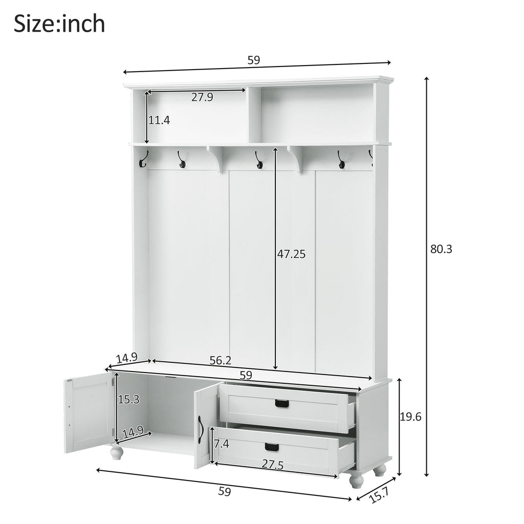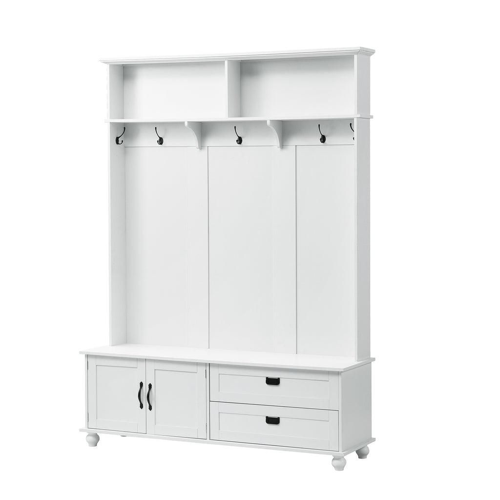 The functional design of this hall tree fully takes into account the actual needs in daily life. In addition to the three hooks under the two top compartments, two hooks are placed on the sides for more storage needs. The bottom of this hall tree is juxtaposed with a cabinet and two drawers to accommodate all kinds of items. And the wide bench is a wonderful place to sit and change shoes.