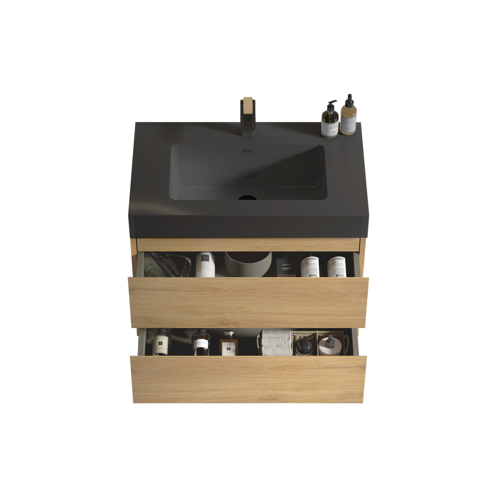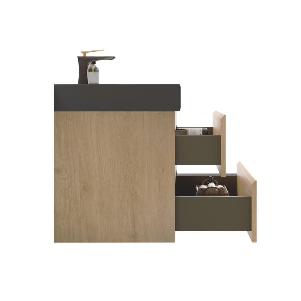 Elevate your bathroom with the sleek and contemporary Alice Single Wall Mounted Bathroom Vanity. Designed for modern aesthetics, Alice combines functionality with style to transform your space. Its striking natural oak finish adds a touch of sophistication, while the black solid surface basin exudes elegance.