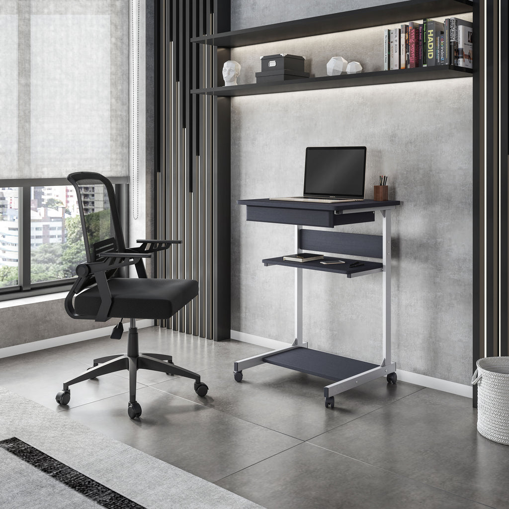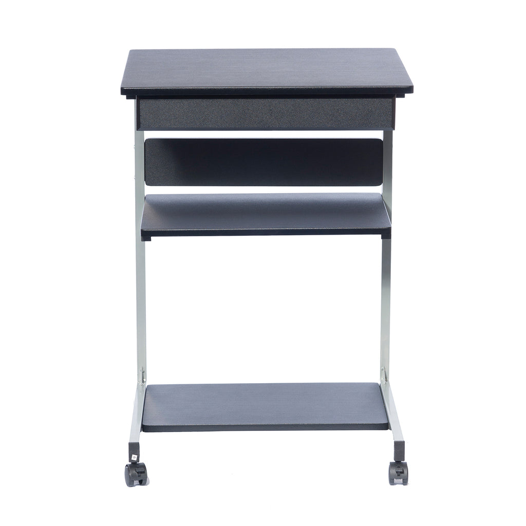 The Techni Mobili Rolling Laptop Desk with Storage works with you to get it all done. Rolling on casters for easy storage in the dorm or home, this desk features a single drawer and two shelves for storage. Two of the fours non-marking nylon casters include locking mechanisms. The desktop has a 90 lb. weight capacity, the drawer can hold up to 10 lbs., the top shelf has a 50 lb. weight capacity and the bottom shelf can hold up to 70 lbs. Panels are made of MDF panels with a moisture laminate veneer atop scratch-resistant powder-coated steel frame. Color: Black Graphite.