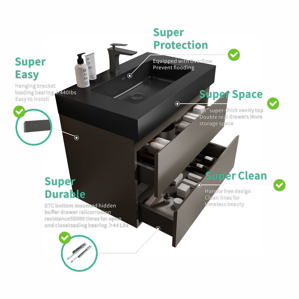 Introducing Alice, the epitome of modern elegance for your bathroom sanctuary. The Alice bathroom vanity is a stunning wall-mounted masterpiece that combines sleek design with exceptional functionality. Crafted with meticulous attention to detail, this contemporary vanity boasts a matt black basin made of luxurious engineered stone, adding a touch of sophistication to your space.