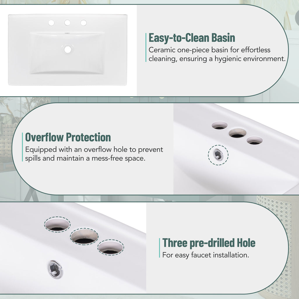 - Ceramic Sink: Paired with an inset ceramic sink, our vanity cabinet maximizes space efficiency. The pristine white ceramic sink not only enhances the aesthetic appeal but also offers a smooth surface that is easy to clean and maintain, preventing water stains effectively.