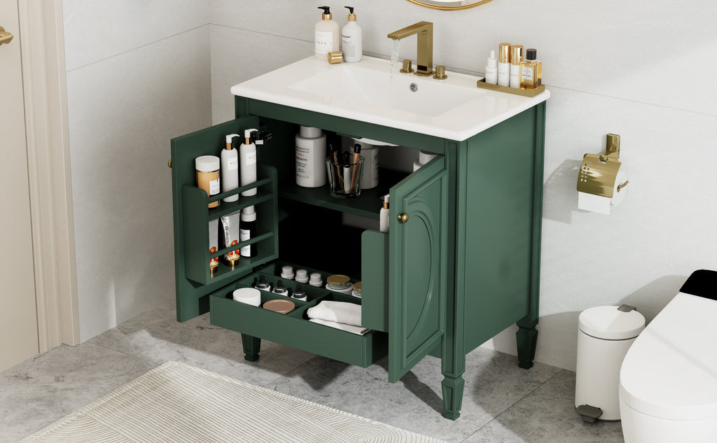 - Storage Space: This bathroom vanity has ample storage space: two doors with two-tier storage shelf, one drawer and an adjustable shelf. You can put soaps, towels, shampoos, tissue paper and other bathroom essentials in it so to keep them away from dust. Especially, the panel in the drawer is removable so you can create this space into diffferent parts according to your storage needs.