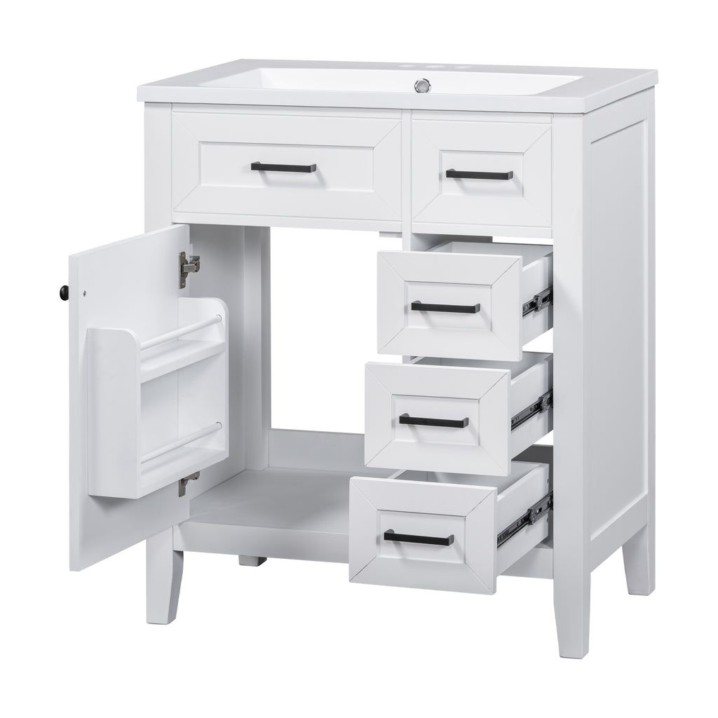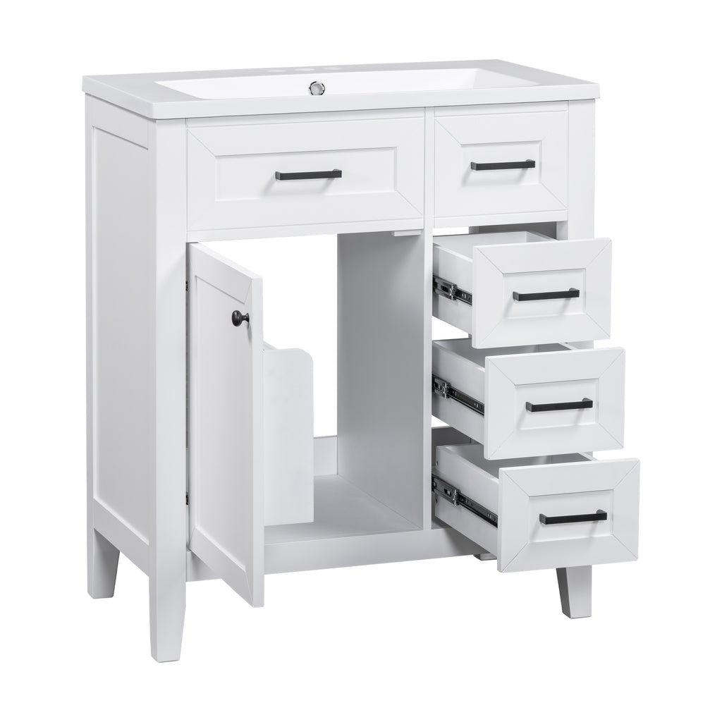 - Stylish 30' Bathroom Vanity: This 30' bathroom vanity is suitable for bathroom in any decoration style. Freestanding white vanity cabinet with black handles complies with your bathroom facilities. The groove design on the door and drawer increases the artistry and aesthetics of the home environment. If you're looking for a simple but stylish bathroom sink vanity, our product will be a great choice to upgrade your bathroom.