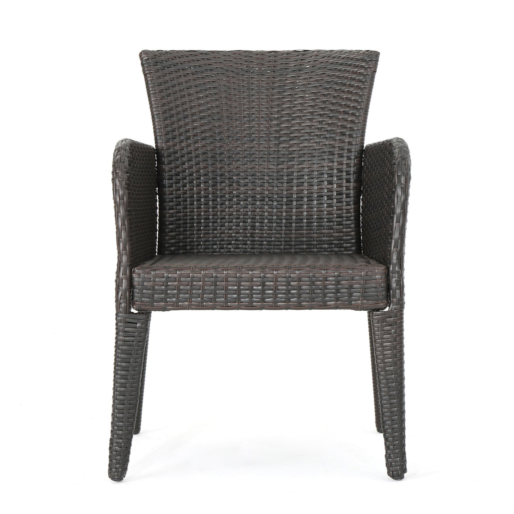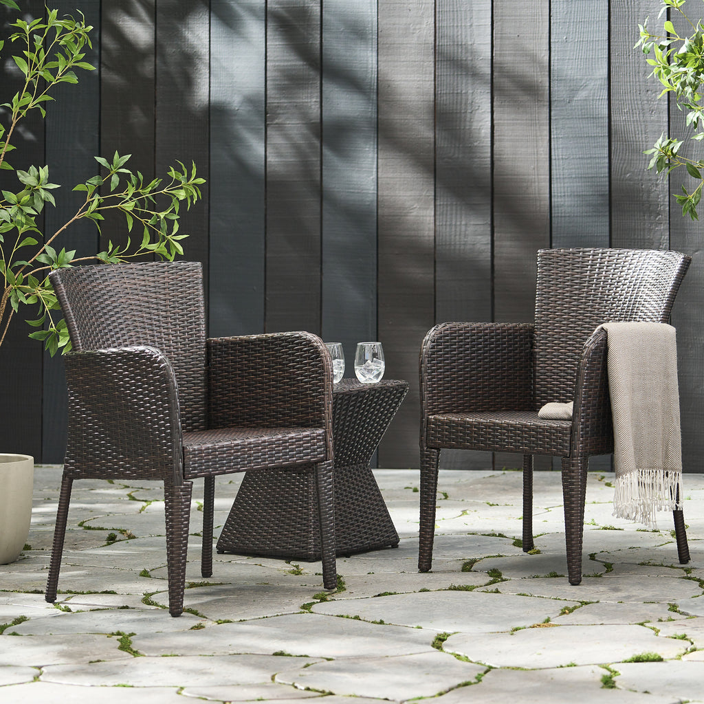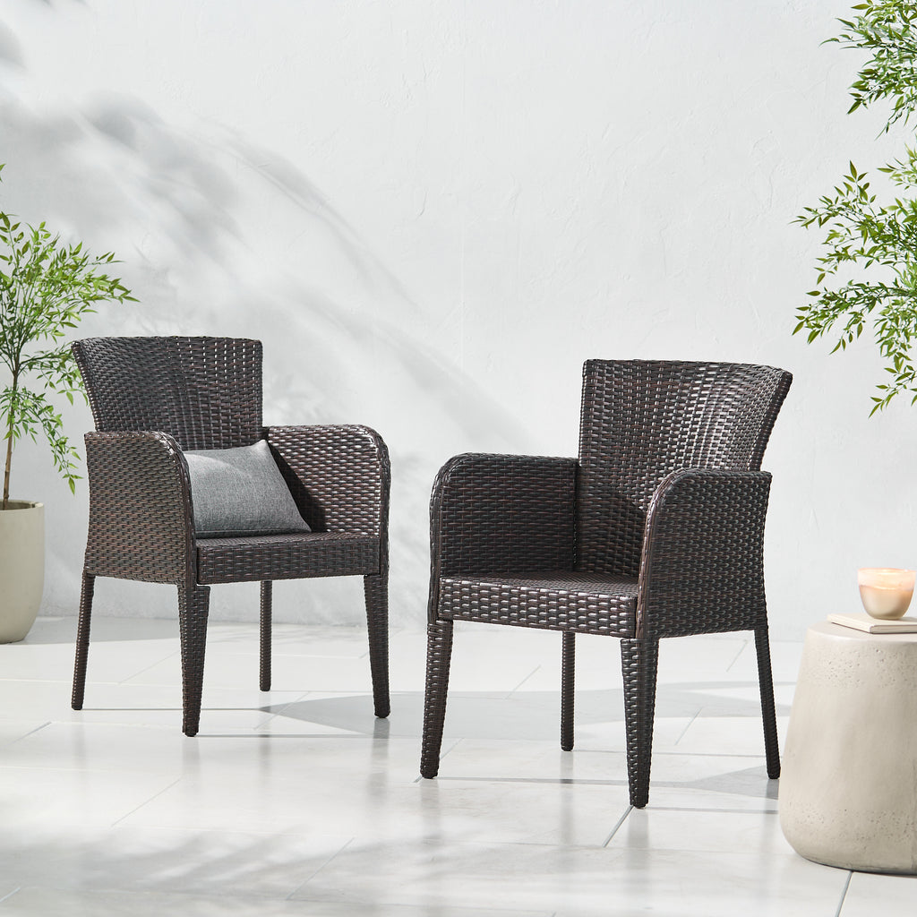 - Offer comfortable seating for guests both indoors and outdoors with this set of two wicker dining chairs. Crafted from PE wicker and a powder-coated iron frame for a sturdy seating option, this set of wicker dining chairs boasts a water-resistant structure to withstand harsh temperatures.