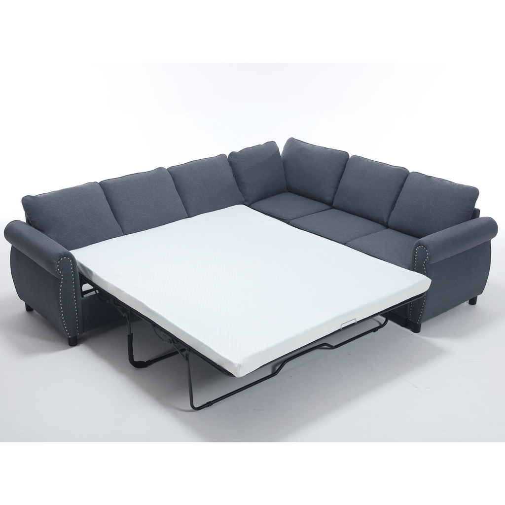 This spacious sectional sofa is perfect for entertaining and relaxing This sectional sofa is the perfect blend of size, style, and comfort. Measuring 104'D x 81'W x33'H, it's spacious enough to fit your entire family and provide ample seating for all your guests. The L-shaped design allows you to pull out the loveseats part in the middle to form a bed, increasing the space utilization of your living room. The sofa is made of high-quality materials including a sturdy wooden frame, metal legs, and soft polyester upholstery fabric. The seating experience is enhanced with spring packs, high-density sponge, and removable backrest cushions.