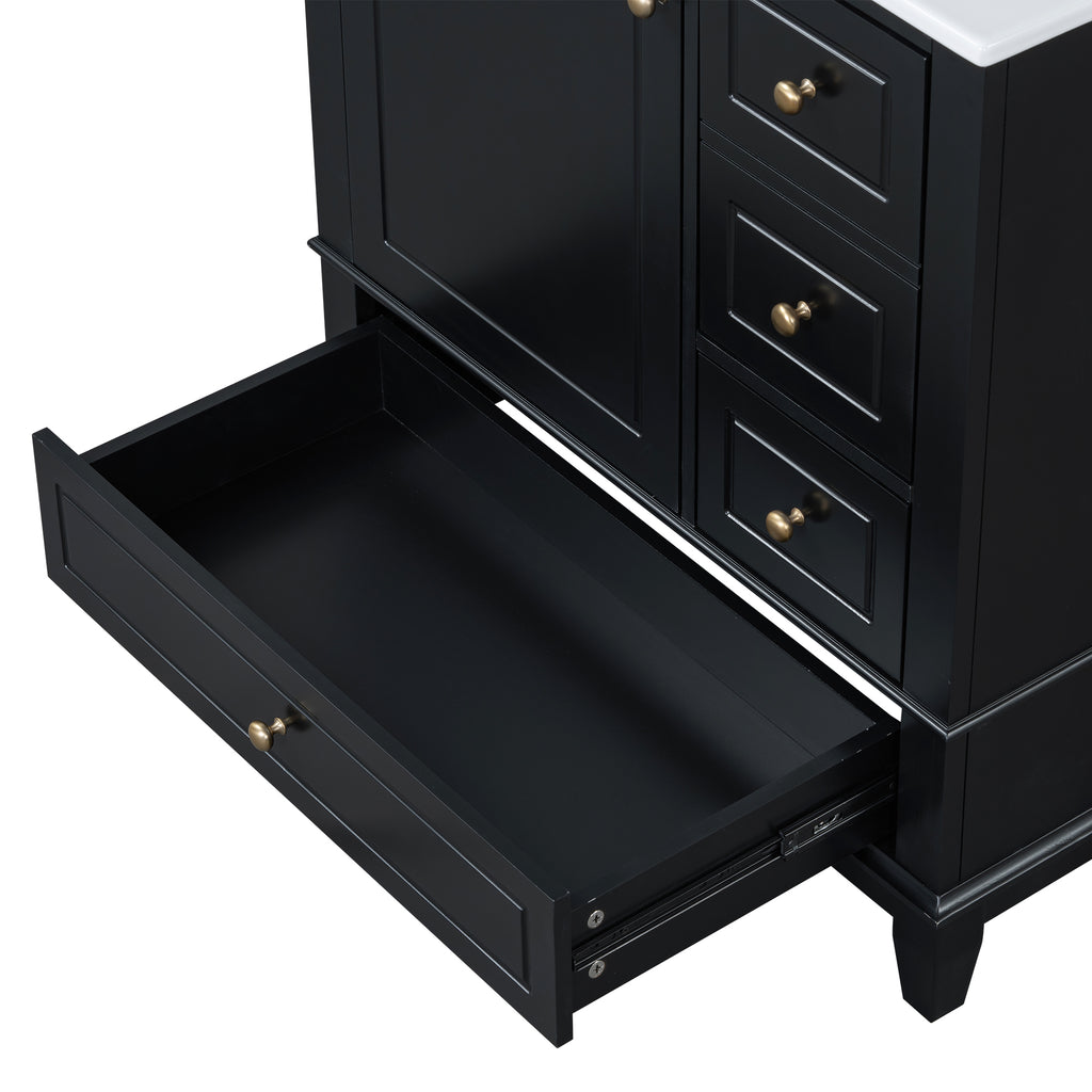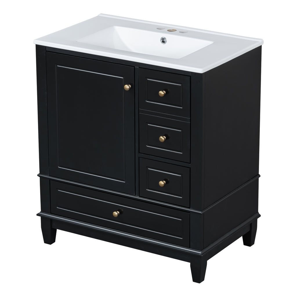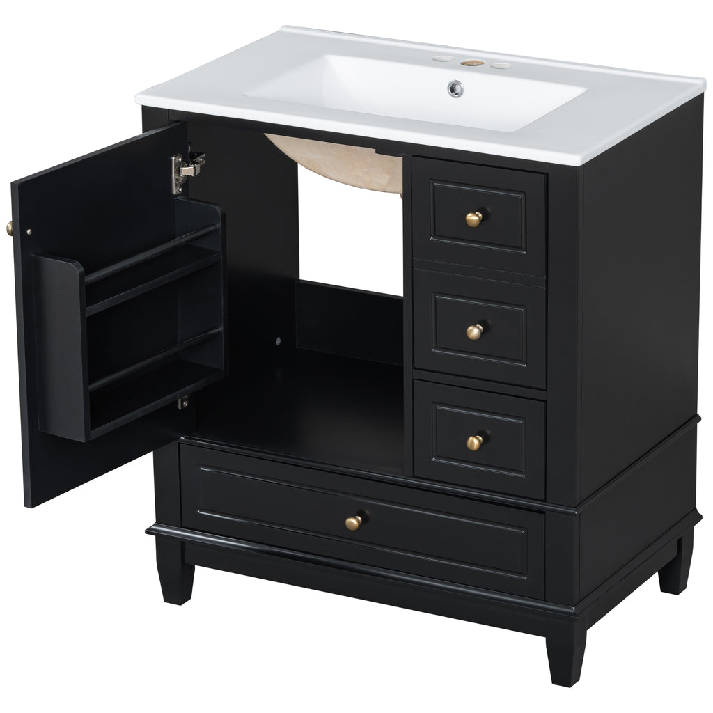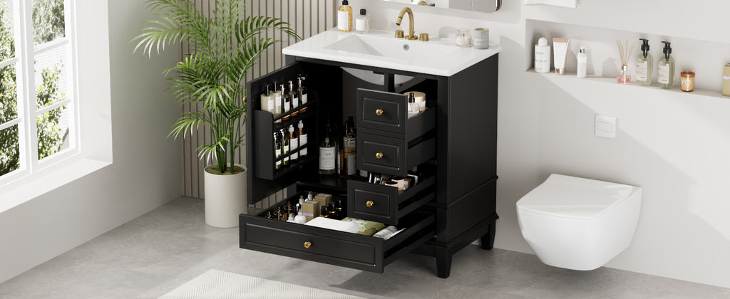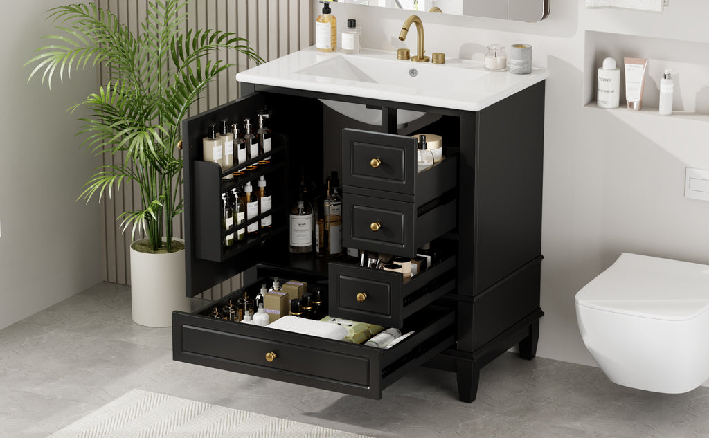 - Storage Space: This bathroom vanity has ample storage space: one door with two-tier storage shelf and three drawers in different sizes. You can put soaps, towels, shampoos, tissue paper and other bathroom essentials in it so to keep them away from dust.