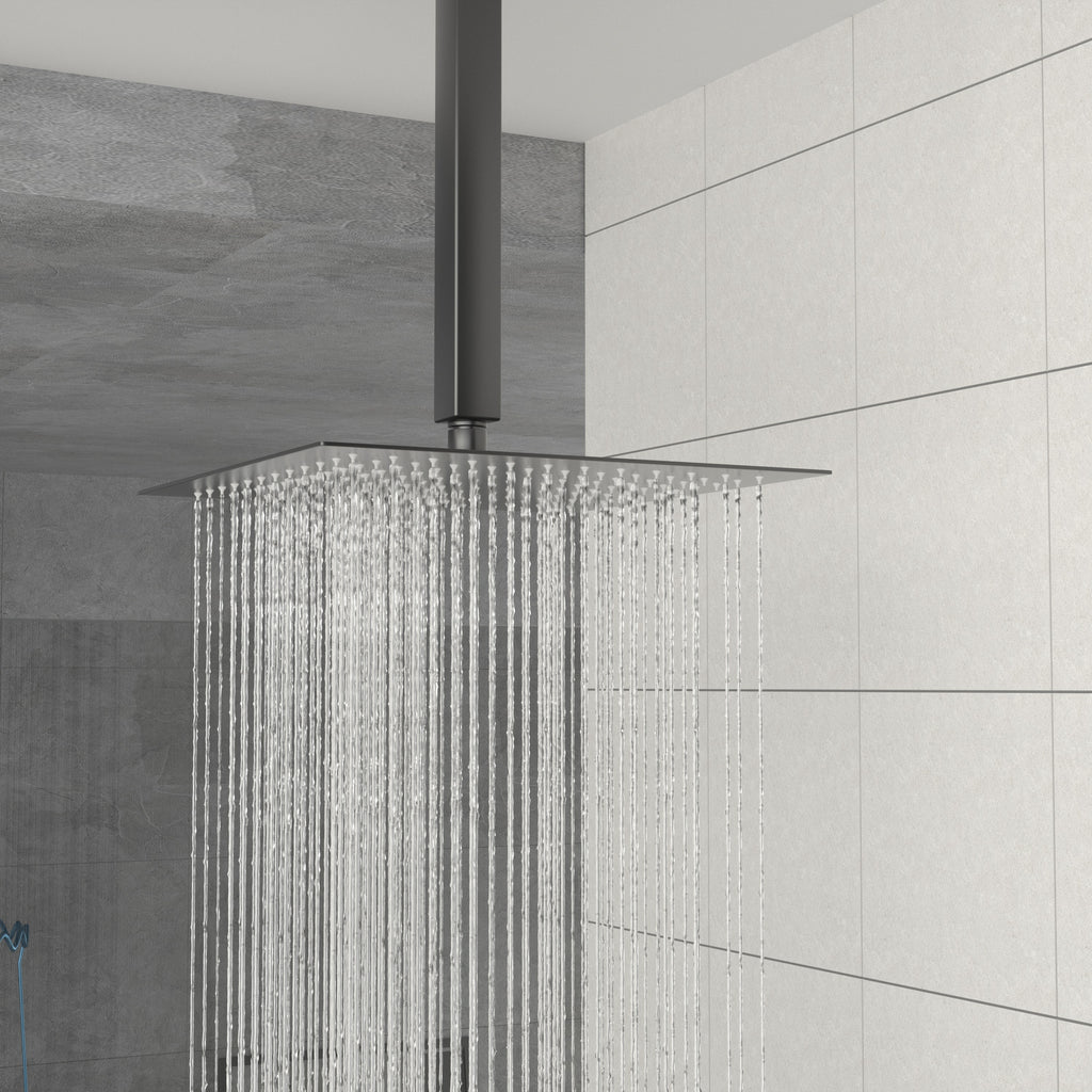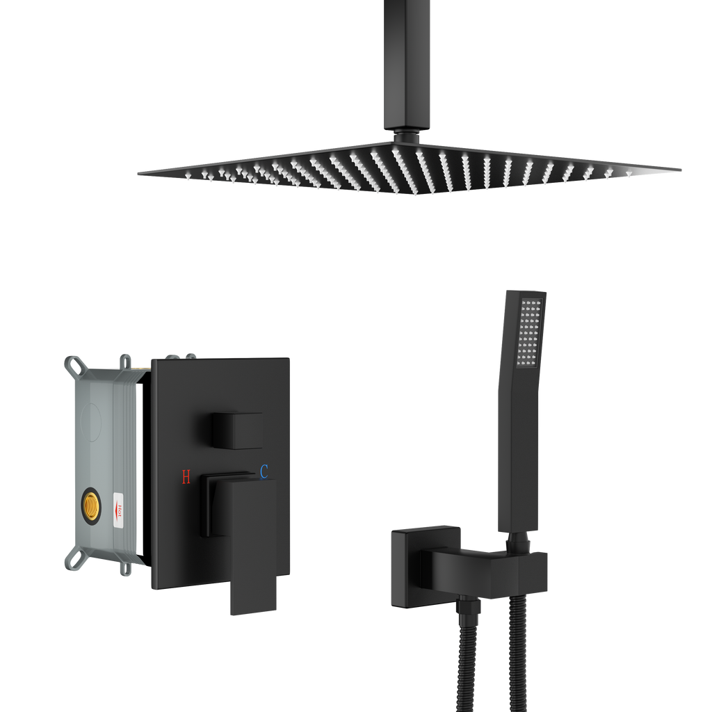- {Included Components}12 inch Square rain shower head,Shower Arm, handheld shower head, 59' shower hose,shower holder, water control valve,Parts and installation instructions.