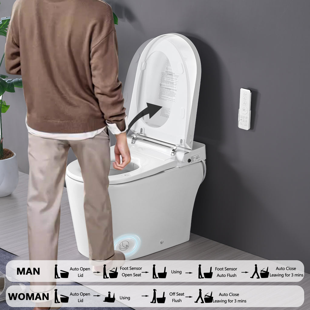 - The smart toilet has functions of flushing without seat, flushing with foot, flushing with remote control and flushing with side button, which completely frees your hands and makes it easy and comfortable.