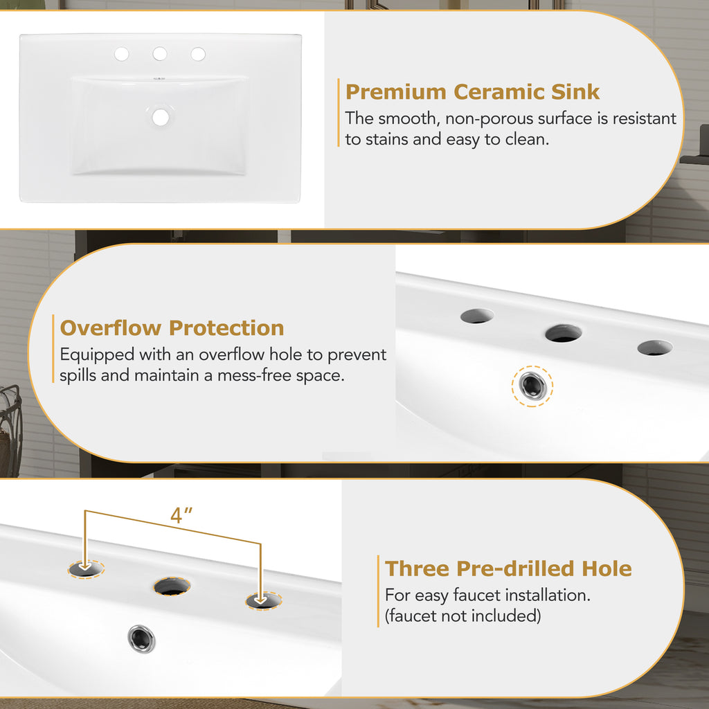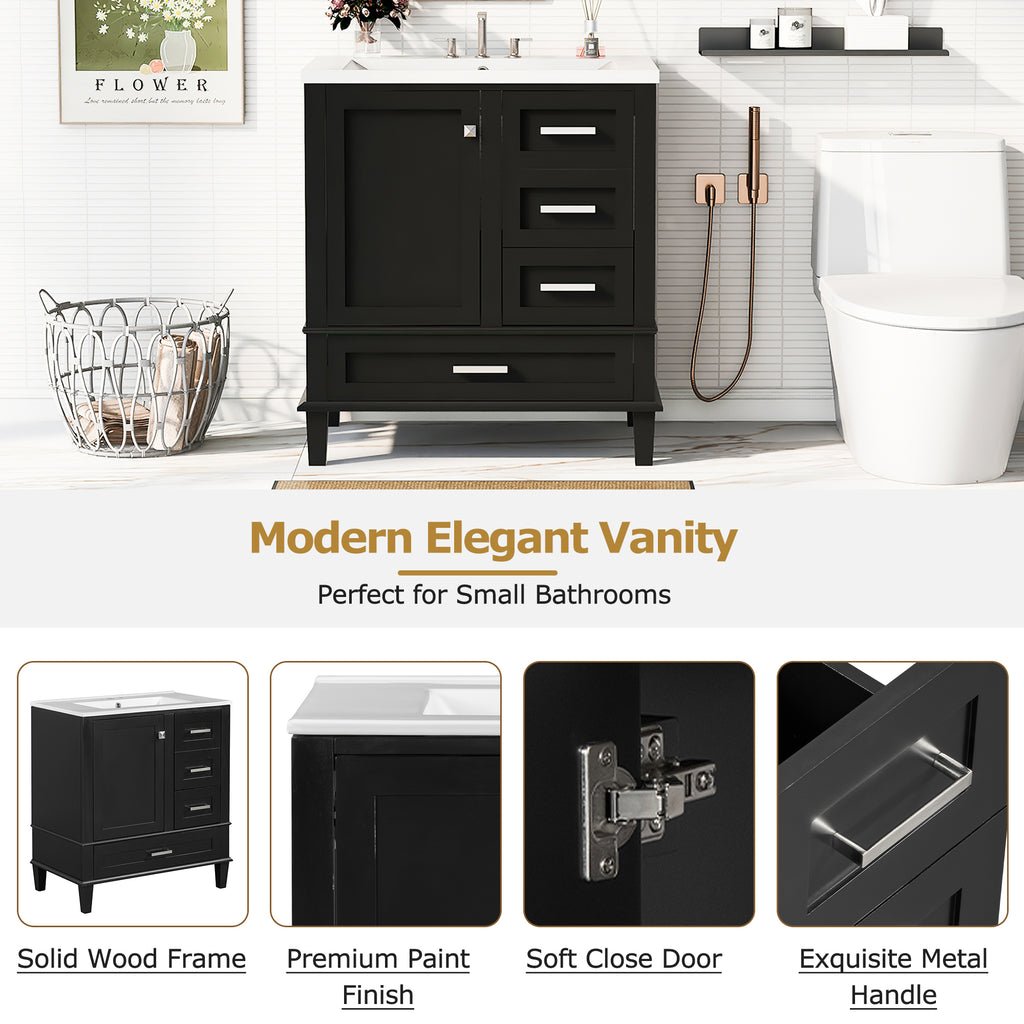 - [Keep Your Bathroom Organized]Equipped with a 30' sink, this bathroom vanity provides ample storage space, featuring 1 cabinet and 3 drawers of different depths and widths, perfect for neatly organizing various bathroom essentials, keeping your bathroom tidy and clutter-free.