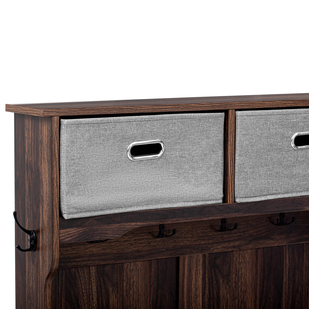 Are you still troubled by the messy clothes and shoes at the entrance, our 3-in-1 multifunctional hall tree can provide you with a good solution! It consist of several parts: spacious storage boxes at the top provide an excellent solution for keeping seasonal items, hats, scarves, or other accessories organized and within reach; 6 double hooks for you to hang coats, scarves, hats and other accessories; spacious bench seat, you can sit down and put on and take off your shoes comfortably; 2 sliding drawers are convenient for you to store keys, umbrellas and other small items that need to be carried out;there is a shoe storage space at the bottom,which can easily keep your entrance tidy.Bring an elegant upgrade to your living room with this hall tree.