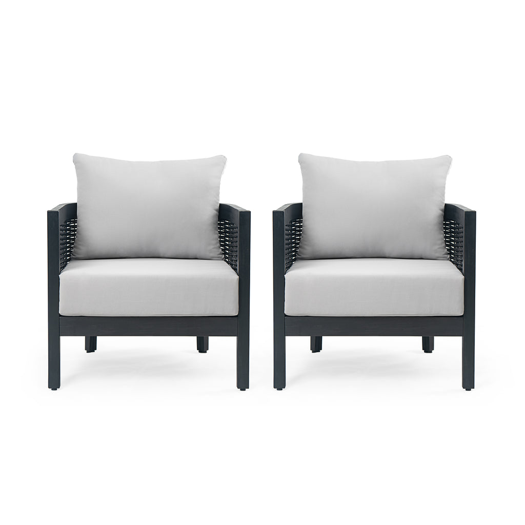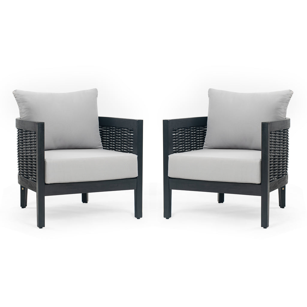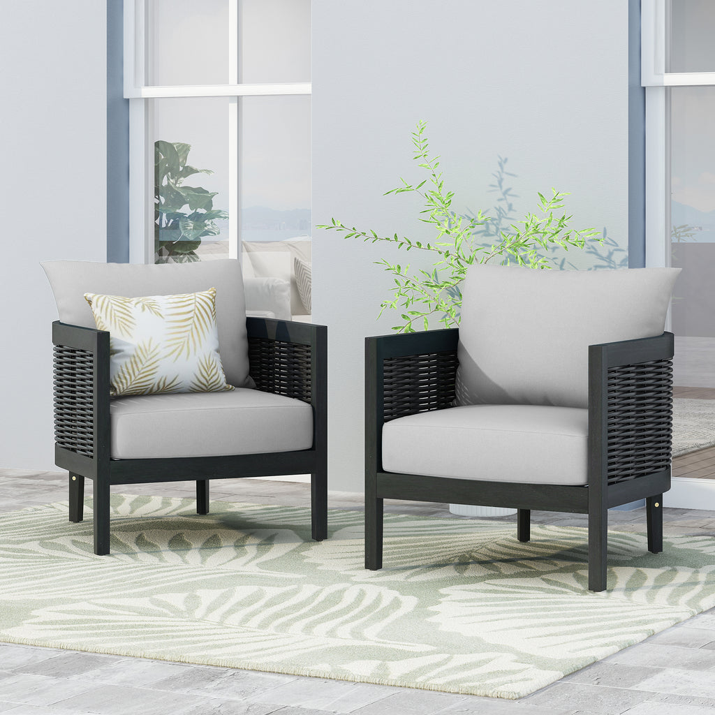 Enjoy the warm sunshine in luxurious seating that is sure to bring an extra boost of style to your space. Combining a gorgeous blend of mixed materials, our club chair set will be a flawless addition to any outdoor lounge area. This can be used as a standalone or can be used to accent your existing furniture, making this a dream for those who love to personalize their space. With solid acacia wood frames, wicker accents, and plush outdoor cushions, these chairs offer hours of conversation for you and your guests.