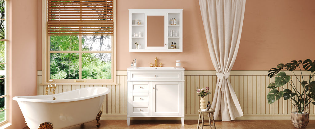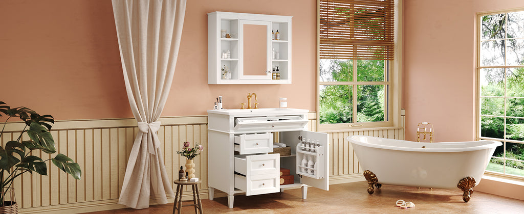 - [ Multi-Purpose Cabinet & Concealed Storage ] Are you looking for stylish and functional storage solutions for your bathroom? Our bathroom vanity provide ample space for all your toiletries and bathroom essentials. The combination of the cabinet body and the drawer perfectly stores all kinds of bathroom products and keeps the necessities away from water stains and dust. Soft-close doors and drawer fronts feature a water-resistant paint finish for durability.