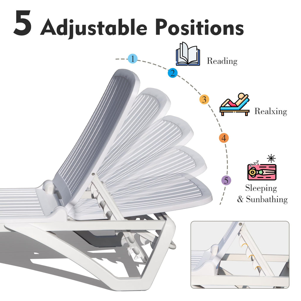 - 5 Adjustable Positions: The outdoor chaise lounge is equipped with 5-position adjustable backrests for ultimate relaxation, including a fully flat option. Different angles can meet your different needs for reading, resting, sleeping, sunbathing, etc.