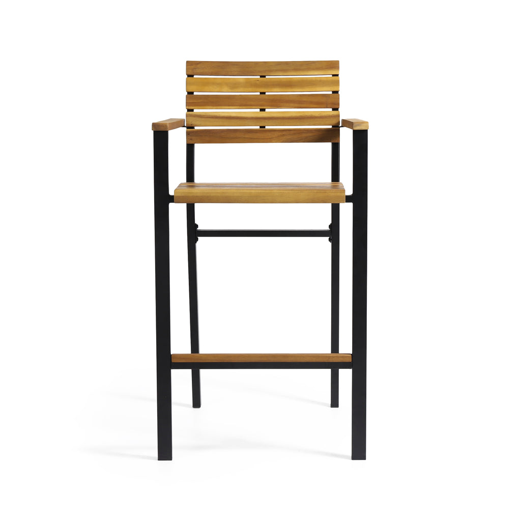 Every outdoor party or casual get-together deserves a refined look that will also provide a comfortable place to seat your friends and family. Composed of rich acacia wood and metal frames, these classy and understated stools will complement any outdoor bar or dining set up, bringing a raw, edgy aesthetic to even the most unassuming backyard space. These are finished with a beautiful slatted design that strikes a perfect balance of industrial charm and stunning sophistication for all to admire. Includes: Two (2) Barstools Material: Acacia Wood Leg Material: Iron Finish: Teak Leg Finish: Black Hand-Crafted Details Assembly Required Dimensions: 21.25 inches deep x 23.00 inches wide x 43.00 inches high Seat Dimensions: 17.75 inches deep x 19.50 inches wide x 28.50 inches high