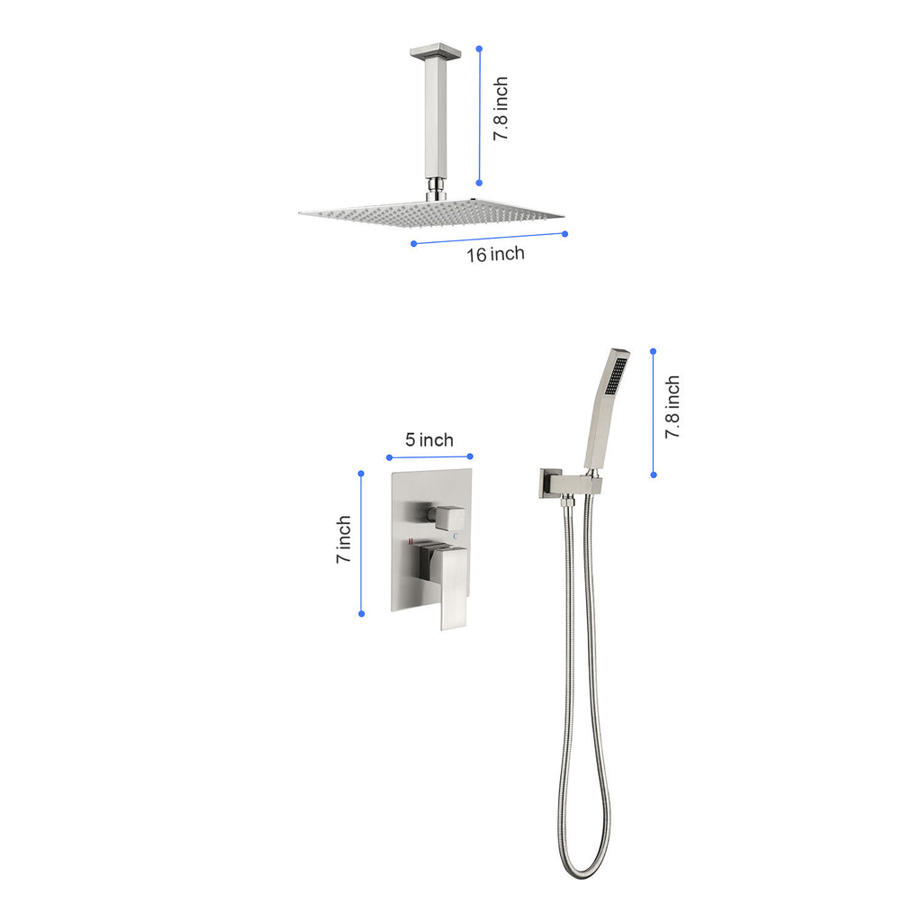 - Installation method: Ceiling-mounted. Includes: shower head, hand shower head, 59-inch shower hose, shower bracket, water control valve, mounting hardware included.