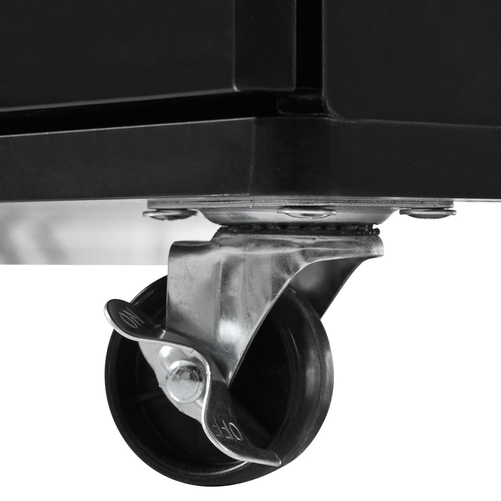 This mobile kitchen island on wheels is equipped with 5 universal wheels, 2 of which are lockable. The central placement of one wheel at the base ensures enhanced overall stability during movement.
