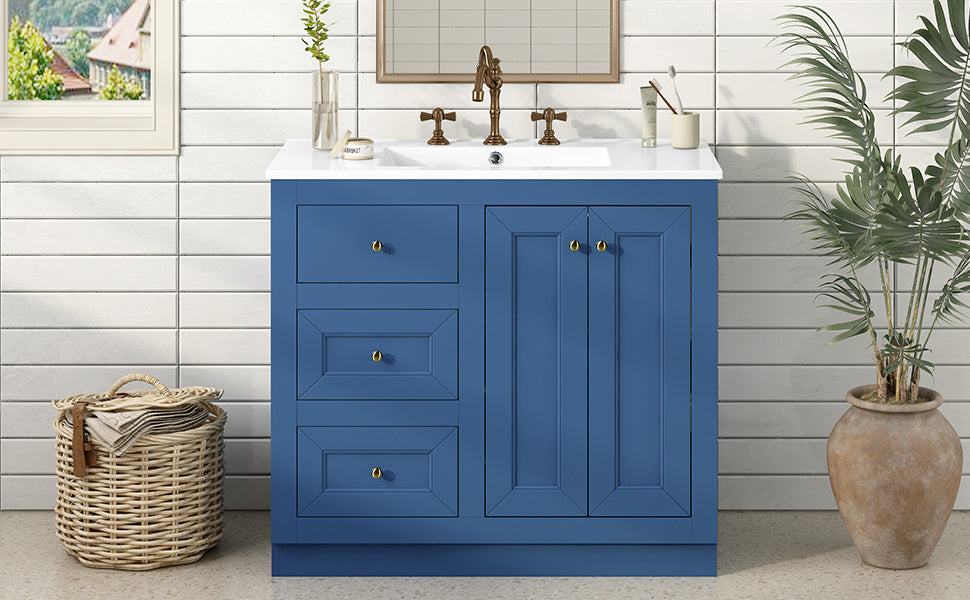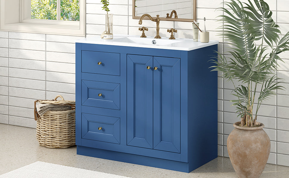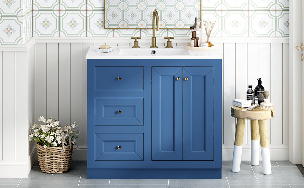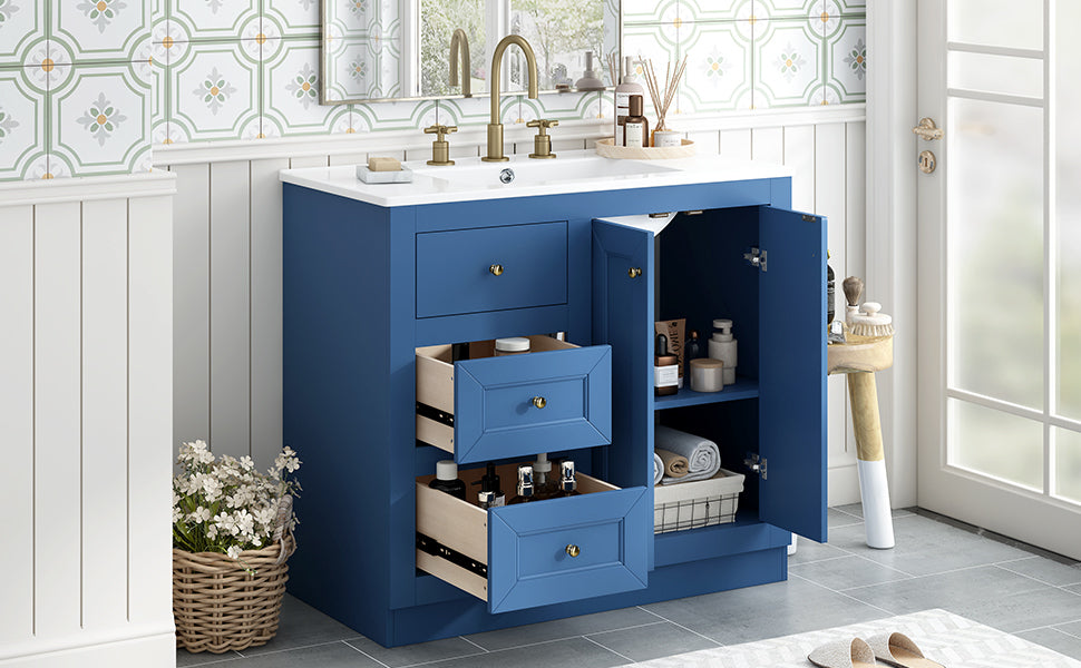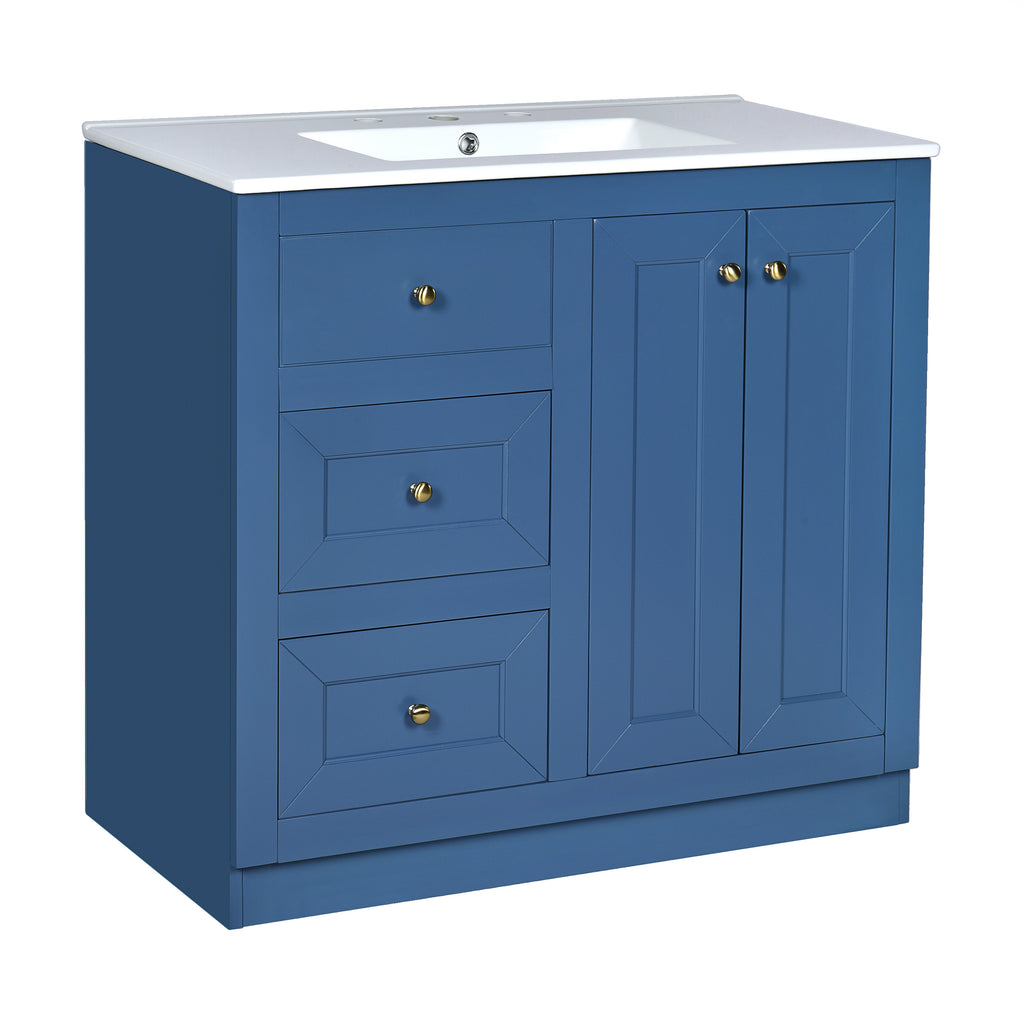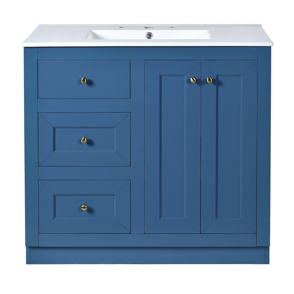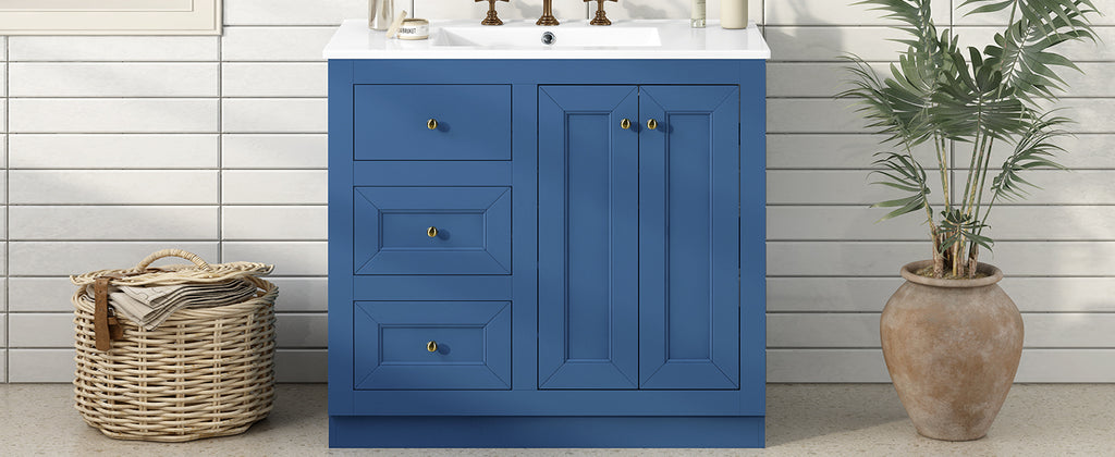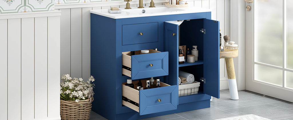 This 36-inch blue ceramic basin bathroom cabinet is carefully designed to combine modernity and practicality, adding a touch of bright color to your bathroom. The high-quality ceramic basin is matched with smooth lines, and the smooth surface is easy to clean, durable and stain-resistant. The cabinet body is made of high-density environmentally friendly board, which is stable and durable, moisture-proof and waterproof, ensuring stability for long-term use. The cabinet design includes two drawers and a storage cabinet, providing abundant storage space to help you easily store bath towels, toiletries and other daily necessities. The drawer adopts a silent slide design, which opens and closes smoothly, greatly improving the user experience.