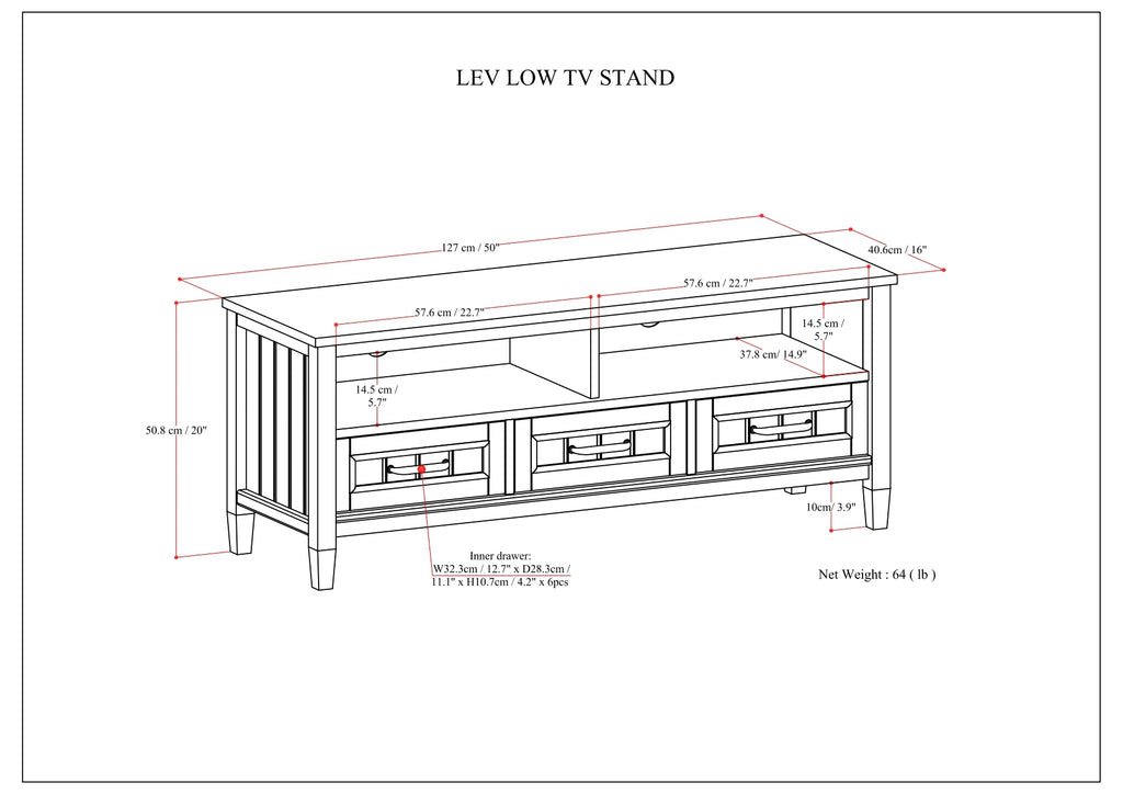 - Features three spacious bottom drawers with metal glides and two large centrally located open shelves