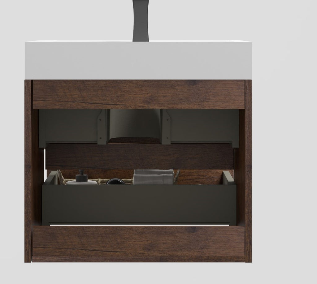 Elevate your bathroom design with the exquisite Alice Floating Bathroom Vanity. Boasting a sleek and modern aesthetic, Alice is the epitome of contemporary sophistication. Its glossy white basin, crafted from premium engineered stone, adds a touch of opulence, while the captivating rosewood finish effortlessly blends warmth and style.
