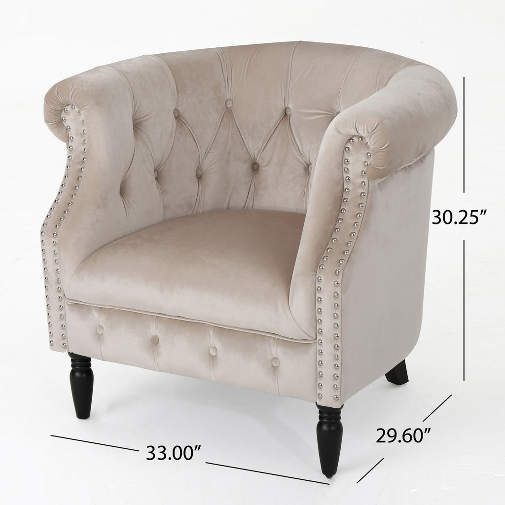 - Provide long-lasting comfort and an air of class to any room in your home. Our sophisticated club chair offers your interior space smooth upholstery and button-tufted diamond stitching, making this your new favorite place to relax and unwind. Featuring a curvaceous tub design and rolled recessed armrests, this piece brings your interior space a lovely upgrade in style. Finished with an elegant nailhead trim and turned birch wood legs, our club chair is the perfect charming touch for your home.