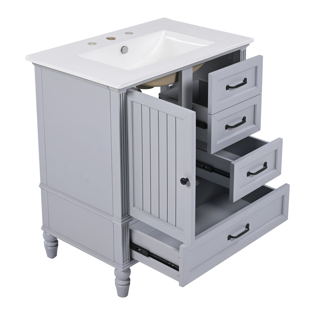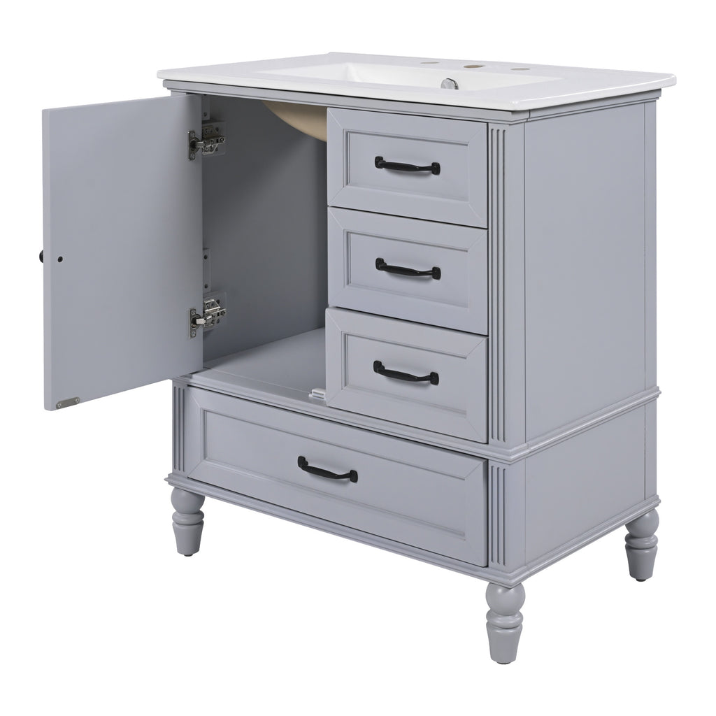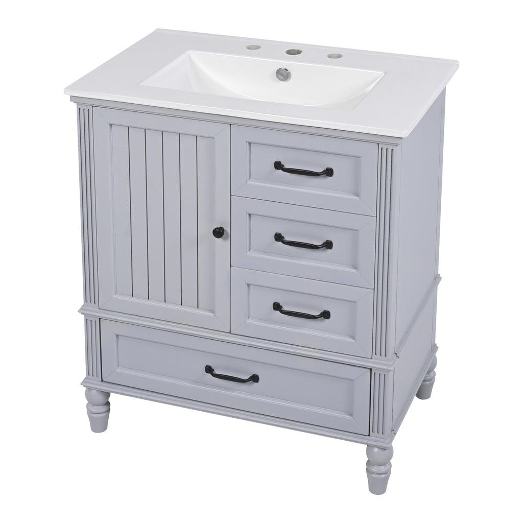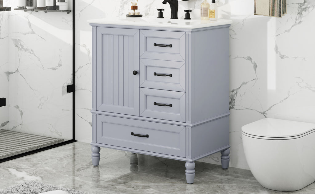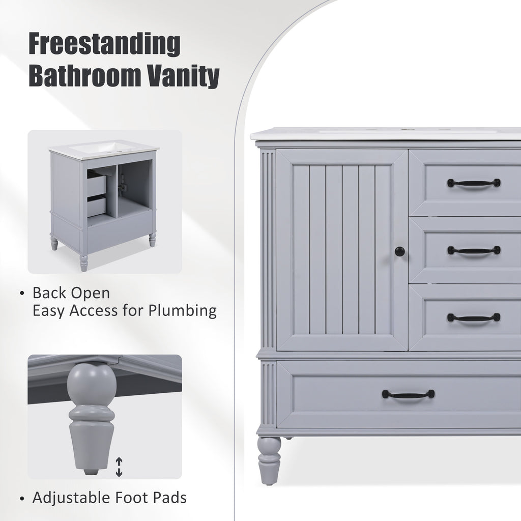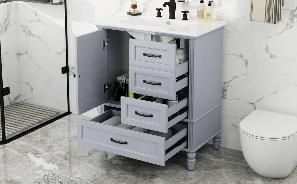 - Vanity with Cabinet & Drawers: This bathroom vanity has ample storage space: one cabinet with a door, two drawers and a big drawer below. You can put soaps, towels, shampoos, tissue paper and other bathroom essentials in it so to keep them away from dust.