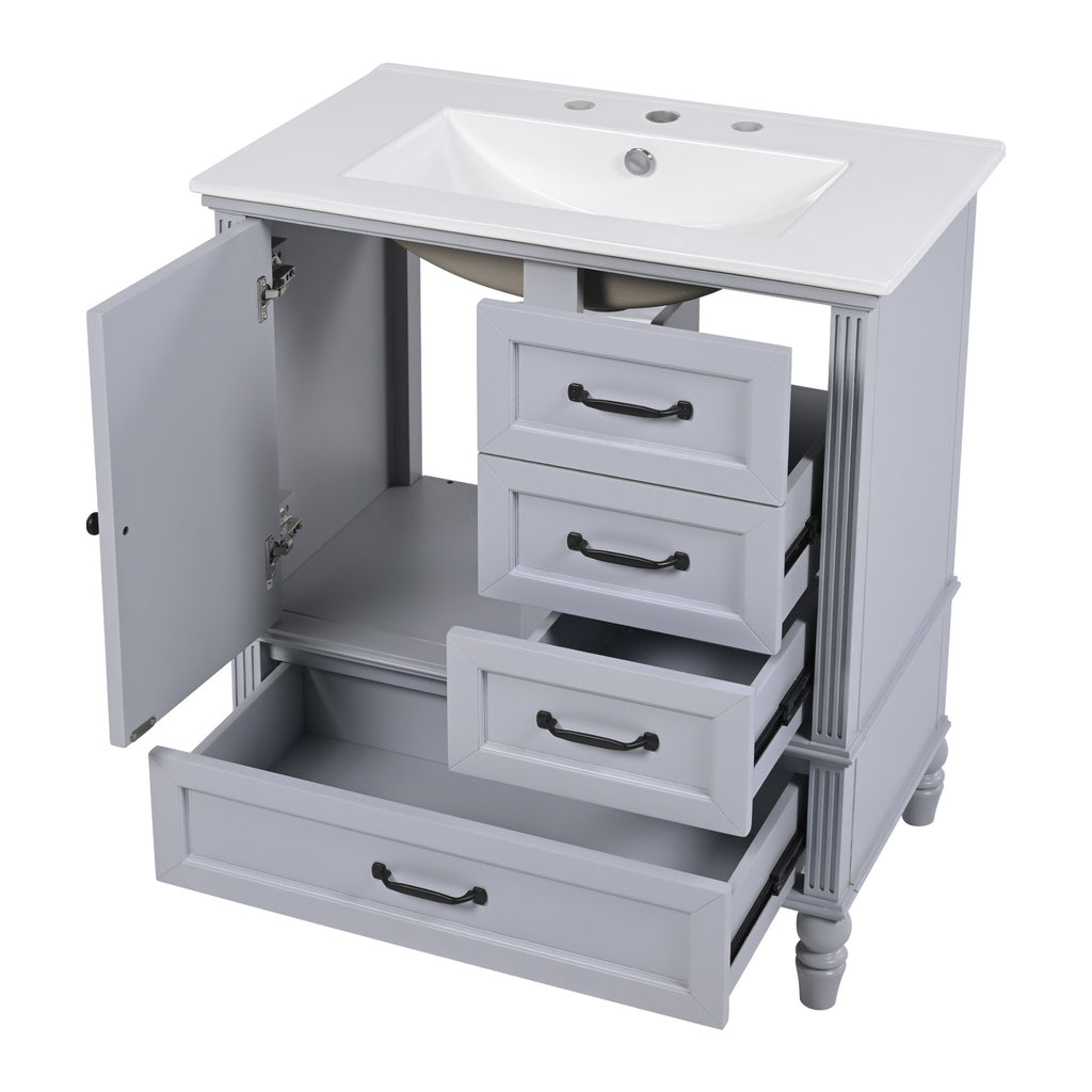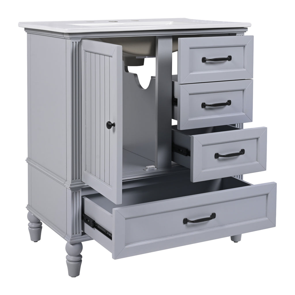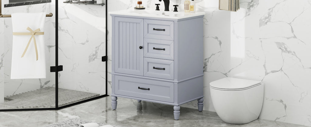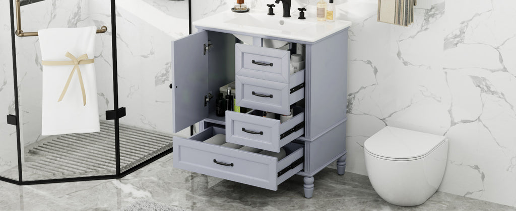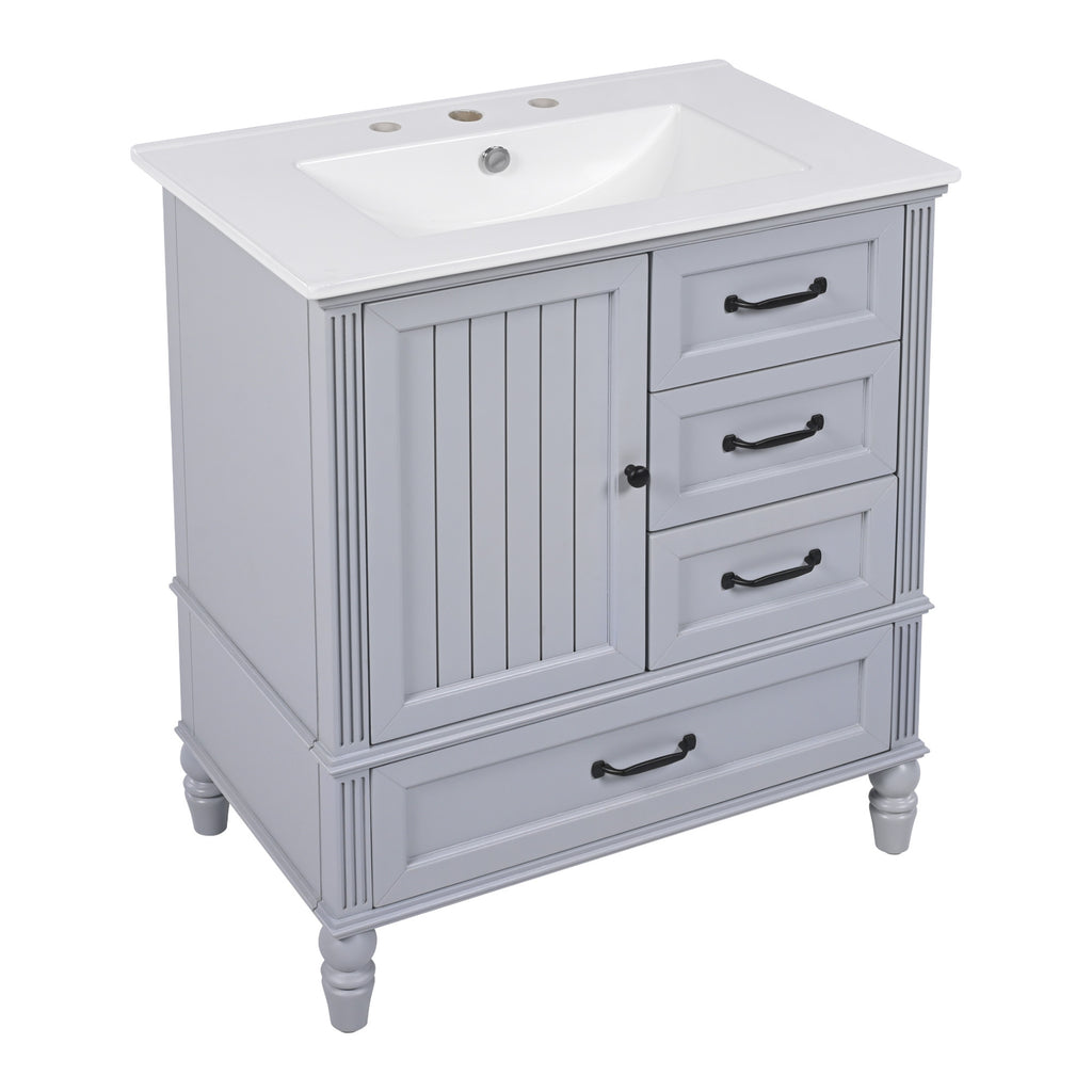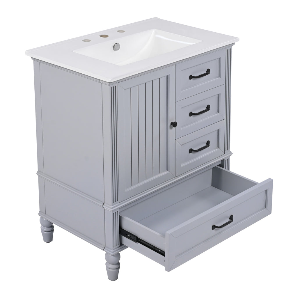 - Vanity with Cabinet & Drawers: This bathroom vanity has ample storage space: one cabinet with a door, two drawers and a big drawer below. You can put soaps, towels, shampoos, tissue paper and other bathroom essentials in it so to keep them away from dust.