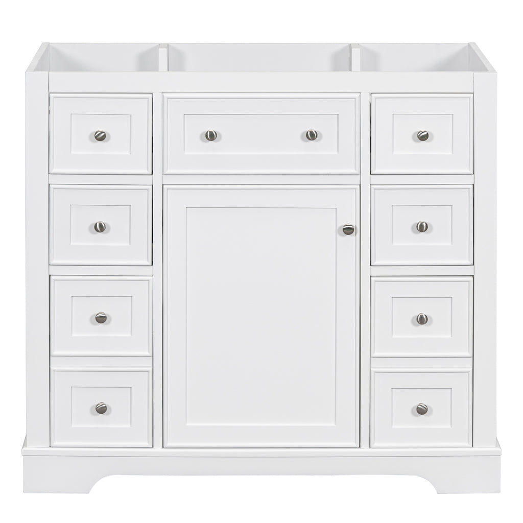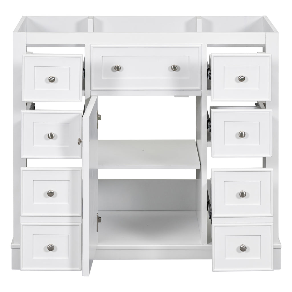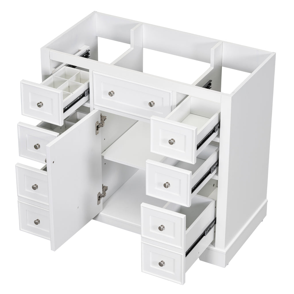 - Vanity with Cabinet & Drawers & Shelf -Considering the humid environment in bathroom, this bathroom vanity has ample enclosed storage spaces: one cabinet with door, three drawers with slide rail each side (the top middle one drawer is for decoration use only), and adjustable shelf in the cabinet. You can put soaps, towels, shampoos, tissue paper and other bathroom essentials in it so to keep them away from dust.