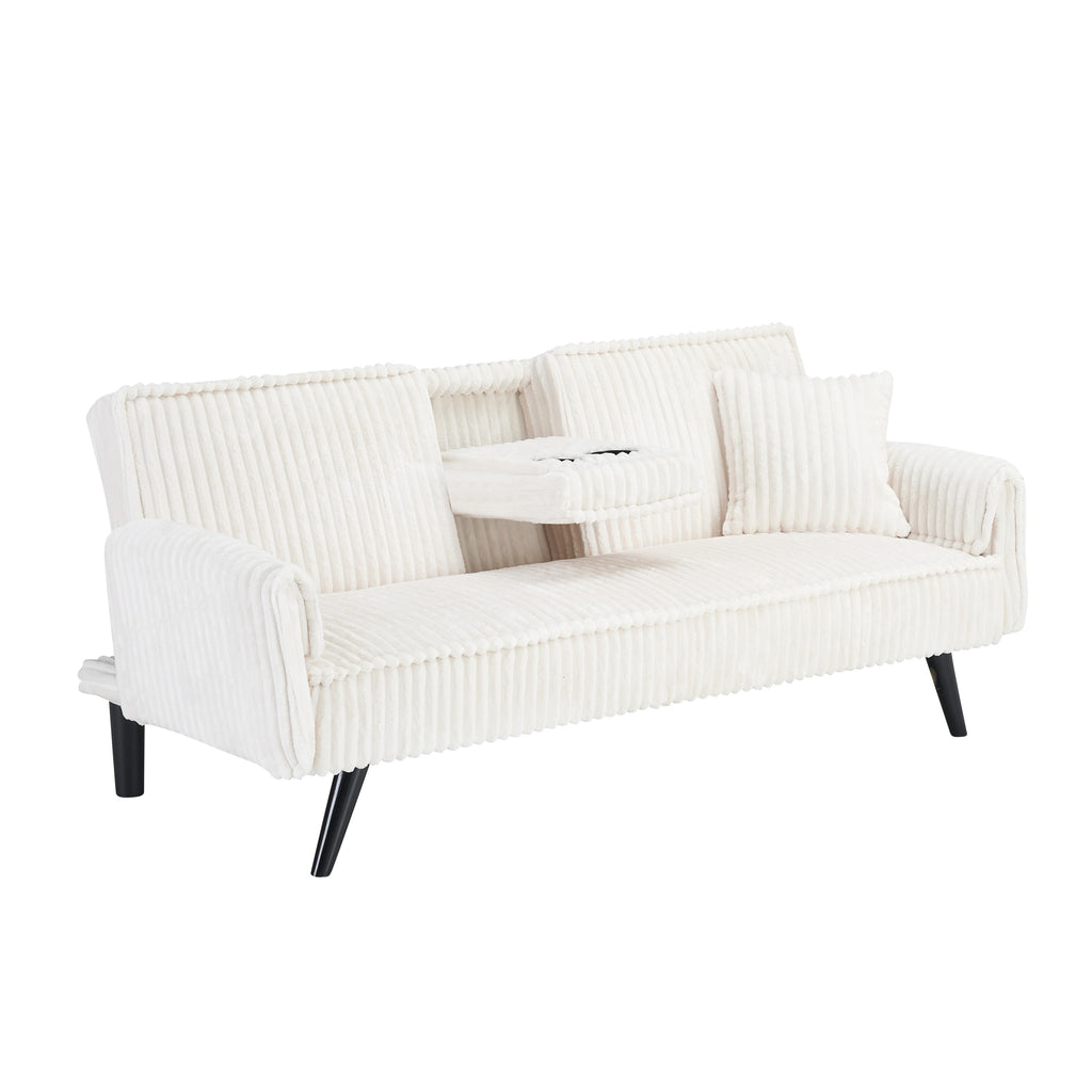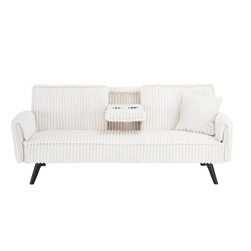 The pristine white sofa, like the first snowfall of winter, is made of corduroy fabric that gives it a unique texture. shade of white easily brightens any space and effortlessly complements various home decor styles. Ingeniously embedded in the center of the sofa back are two cup holders, are easy to operate and perfect for hosting a few friends. The backrest can be adjusted to three different angles: the first position allows you to lean back slightly stretching your spine; the second position offers a deeper recline, providing support for your lower back; and the third position transforms the sofa into a soft bed with single push, perfect for when you're tired and need to stretch out. The sofa's frame is made of selected high-quality solid wood and plywood, providing a 'skeleton' with excellent load-bearing capacity. Choosing this sofa is not just about adding a piece of furniture to your home, but also bringing in comfort,, and a quality lifestyle.