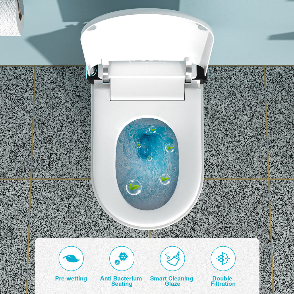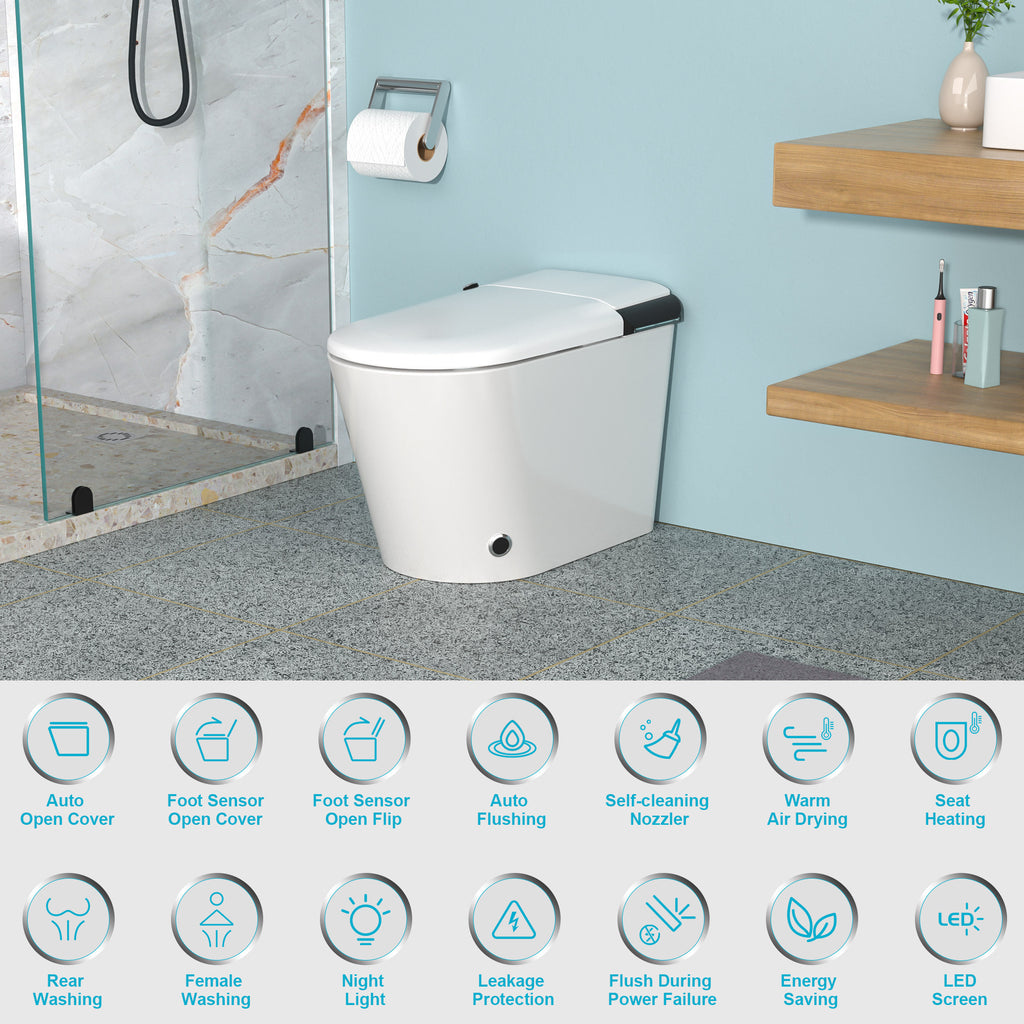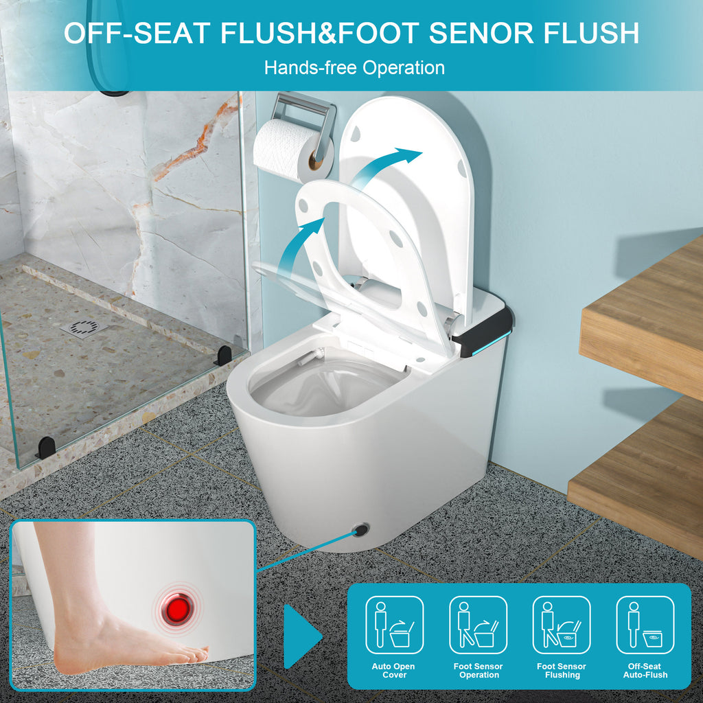 - Automatic Flush Toilet: Our smart toilet's four flush options: Foot Sensor Flushing, automatic Off-seat Flushing, plus easy Side Button or Remote Control Flush. No more bending or forgetting! Just wave your foot, sit, or use the buttons/remote to flush. Totally hands-free and easy peasy.