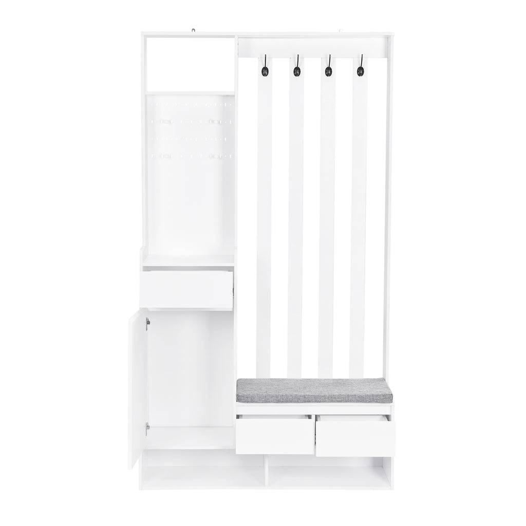 - Our all-in-one hall tree bids farewell to entryway chaos! This sleek unit integrates shelf space, storage cabinet, pegboard, drawer, 4 coat hooks, and seating bench, offering a complete solution to maintain a tidy and organized entrance.