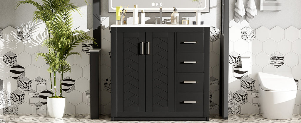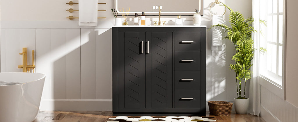 - [ Multi-Purpose Cabinet & Concealed Storage ] Are you looking for stylish and functional storage solutions for your bathroom? Our bathroom vanity provide ample space for all your toiletries and bathroom essentials. The combination of the cabinet body and the drawer perfectly stores all kinds of bathroom products and keeps the necessities away from water stains and dust. Soft-close doors and drawer fronts feature a water-resistant paint finish for durability.