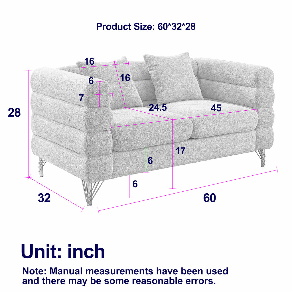 Carton quantity: 2 pcs. Product Name: two-person sofa. DIMENSIONS. Please refer to the picture. Detailed Size. Please refer to the picture. Package Size. Please refer to description. Package Weight (lbs). Please refer to description. Product Weight (lbs). Please refer to description. Does this product include pillows: 2 pillows. Weight Capacity: 250 lbs/seat. Assembly Required. Required (see instructions). Fabric Material: Teddy. Frame Material: Pine + Eucalyptus + Plywood. Seat structure: Foam + spring pack. Upholstery: Cotton. Sofa foot material: metal. Place of Origin: China. Note: Manual measurement is used, there may be some reasonable error. All pictures are taken based on actual samples, there may be slight color difference due to light or monitor.