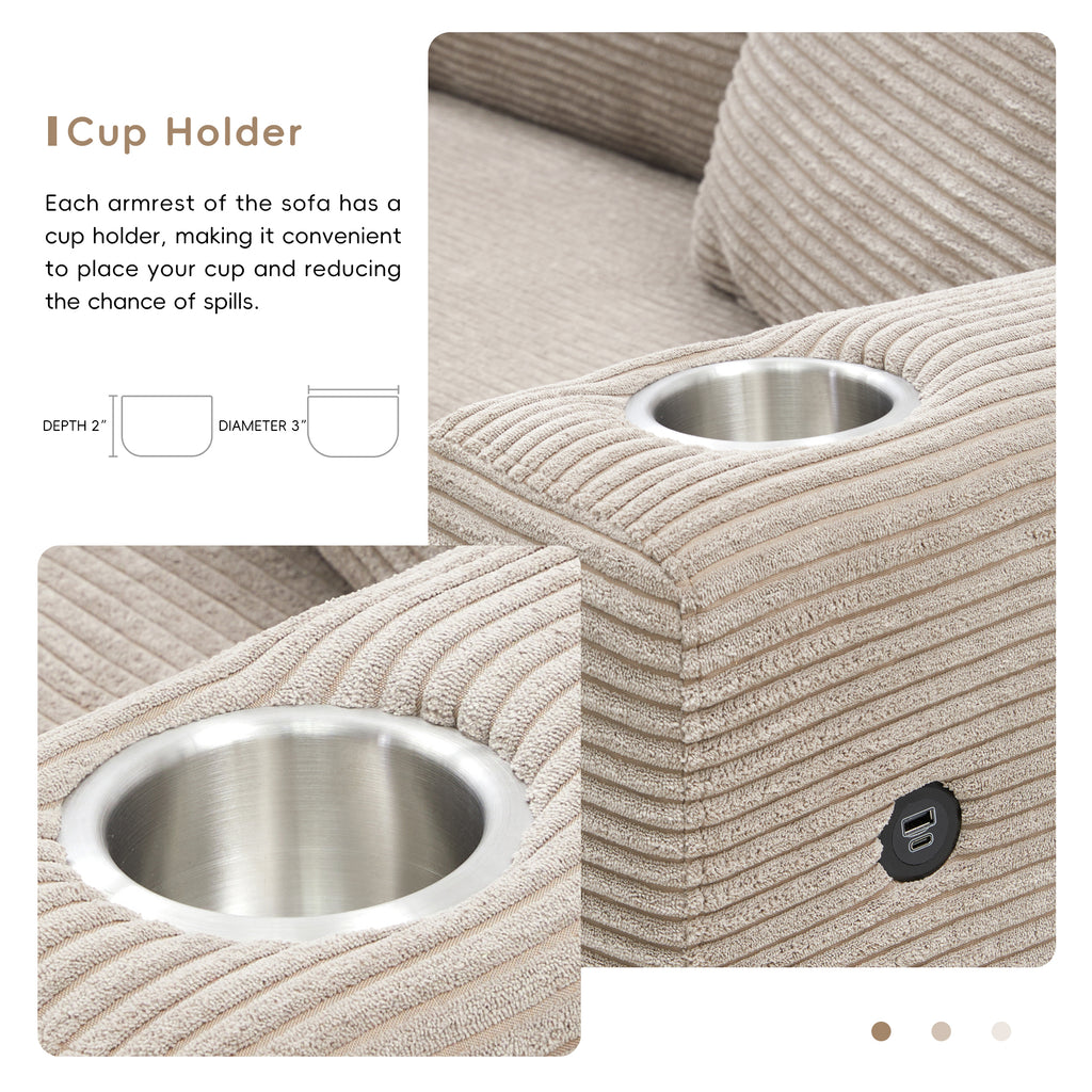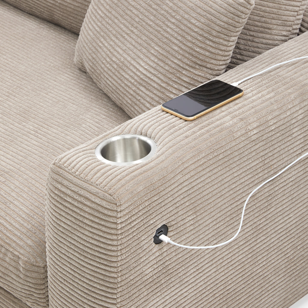 The extra wide seat and chaise lounge offers luxurious and comfortable seating options with convenient features such as cup holders and USB charging ports. The extra thick corduroy fabric adds to the overall comfort and beauty of the sofa. A great choice for living!