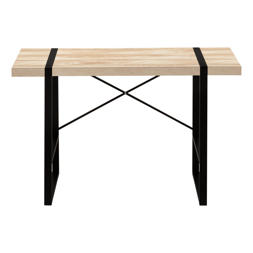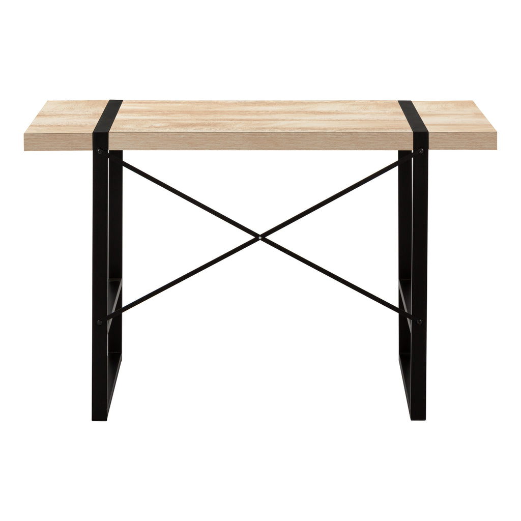 - Robust metal legs in a black finish are incorporated into the desktop for an interesting visual effect